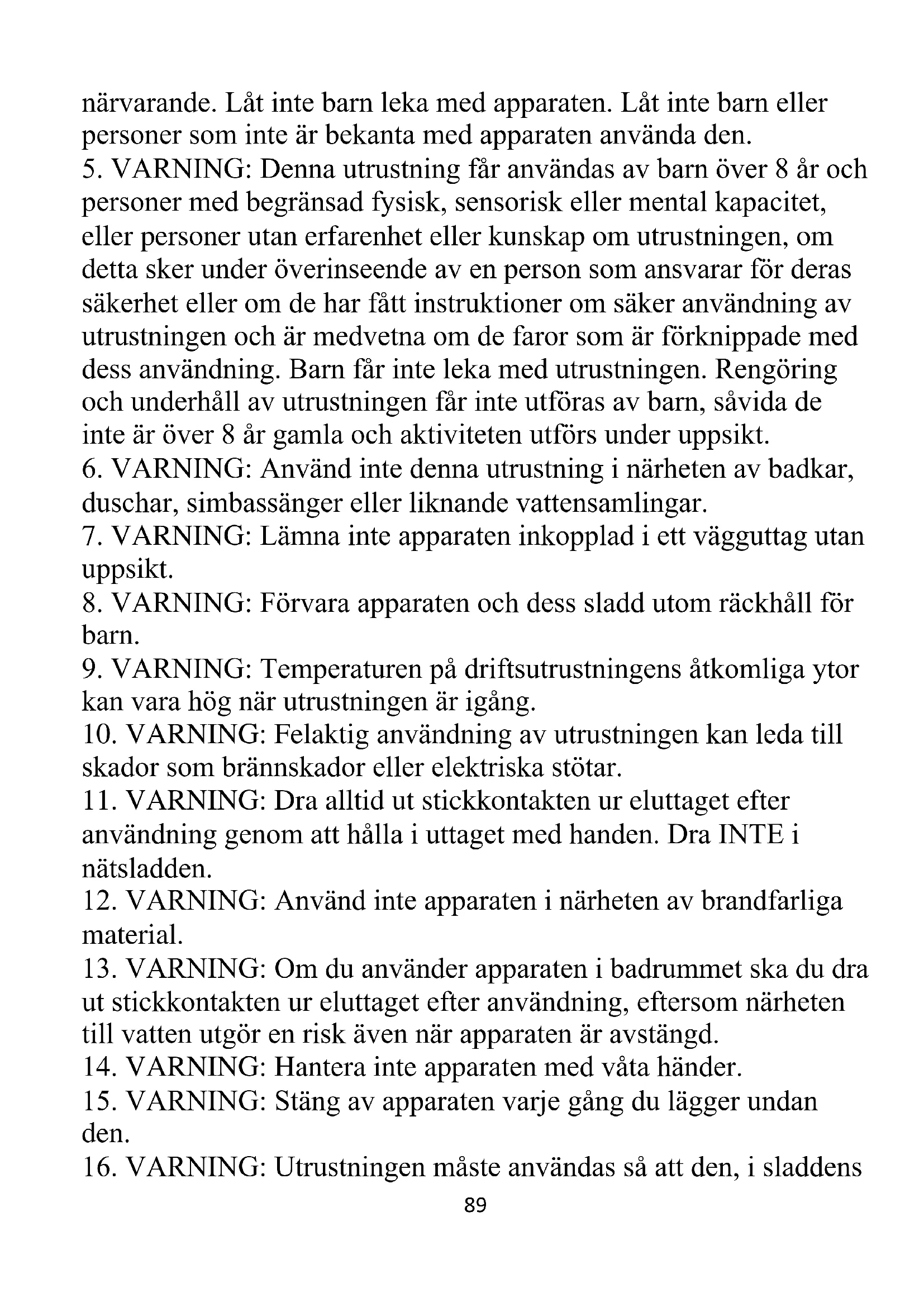 5. VARNING: Denna utrustning får användas av barn över 8 år och