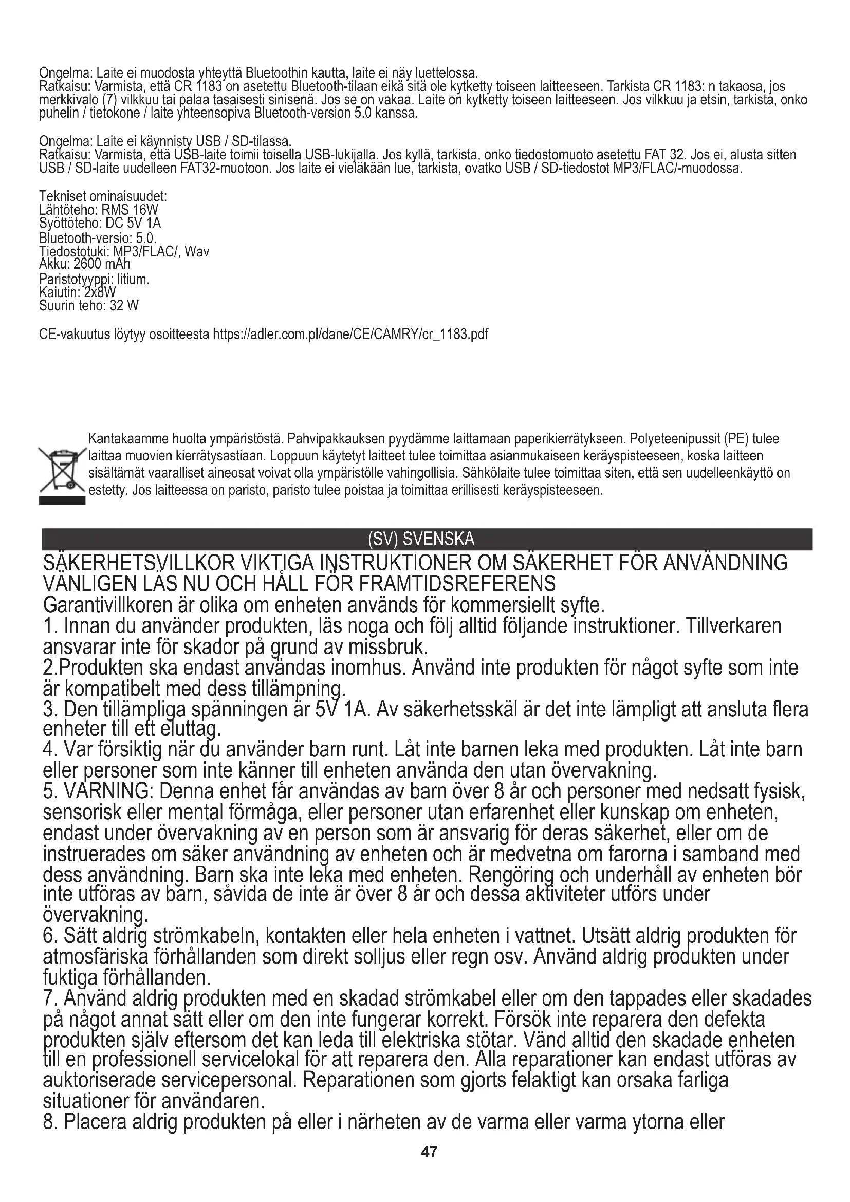 Enheten har två ikonfärger vid indikatorn Blått ljus som blinkar visar att enheten är i parning Blått ljus är stabilt och tänt. Enheten är ansluten till en annan enhet via Bluetooth. Rött stabilt ljus. Enheten laddas. Felsökning: Problem: Enheten ansluter inte via Bluetooth, enheten visas inte i listan. Lösning: Se till att CR 1183 är inställd på Bluetooth-läge och inte är ansluten till en annan enhet. Kontrollera baksidan av CR 1183 om indikatorlampan (7) blinkar eller är stabil i blå färg. Om det är stabilt. Enheten är ansluten till en annan enhet. Om jag blinkar och söker, kontrollera om din telefon / dator / enhet är kompatibel med Bluetooth version 5.0. Problem: Enheten startar inte i USB / SD-läge. Lösning: Se till att USB-enheten fungerar på en annan USB-läsare. Om ja, kontrollera om filformatet är inställt på FAT 32. Om inte, formatera om USB / SD-enheten till FAT32-format. Om enheten fortfarande inte läser, kontrollera om filerna på USB / SD är i MP3/FLAC/- format. Teknisk specifikation: Uteffekt: RMS 16W Ingångseffekt: DC 5V 1A Bluetooth-version: 5.0. Filstöd: MP3/FLAC/, Wav Batteri: 2600 mAh Batterityp: Litium. Högtalare: 2x8W Max effekt: 32W CE-deklaration finns: https://adler.com.pl/dane/CE/CAMRY/cr_1183.pdf Vi sköter om miljön. Överlämna förpackningar i kartong till pappersavfall. Polyetylensäckar (PE) slängs i avfallsbehållare för plast. Man bör lämna en gammal apparat till en riktig återvinningscentral, eftersom farliga komponenter i apparaten kan orsaka fara till miljön. En elektrisk apparat bör lämnas för att minska förnyad användning av denna. Om apparaten innehåller batterier, bör man ta bort dem och lämna dem separat till återvinningscentraler.50 BEZPEČNOSTNÉ PODMIENKY DÔLEŽITÉ POKYNY PRE BEZPEČNOSŤ POUŽITIA PROSÍM POZORNE SI PREČÍTAJTE A UCHOVÁVAJTE PRE BUDÚCE REFERENCIE Záručné podmienky sa líšia, ak sa zariadenie používa na komerčné účely.