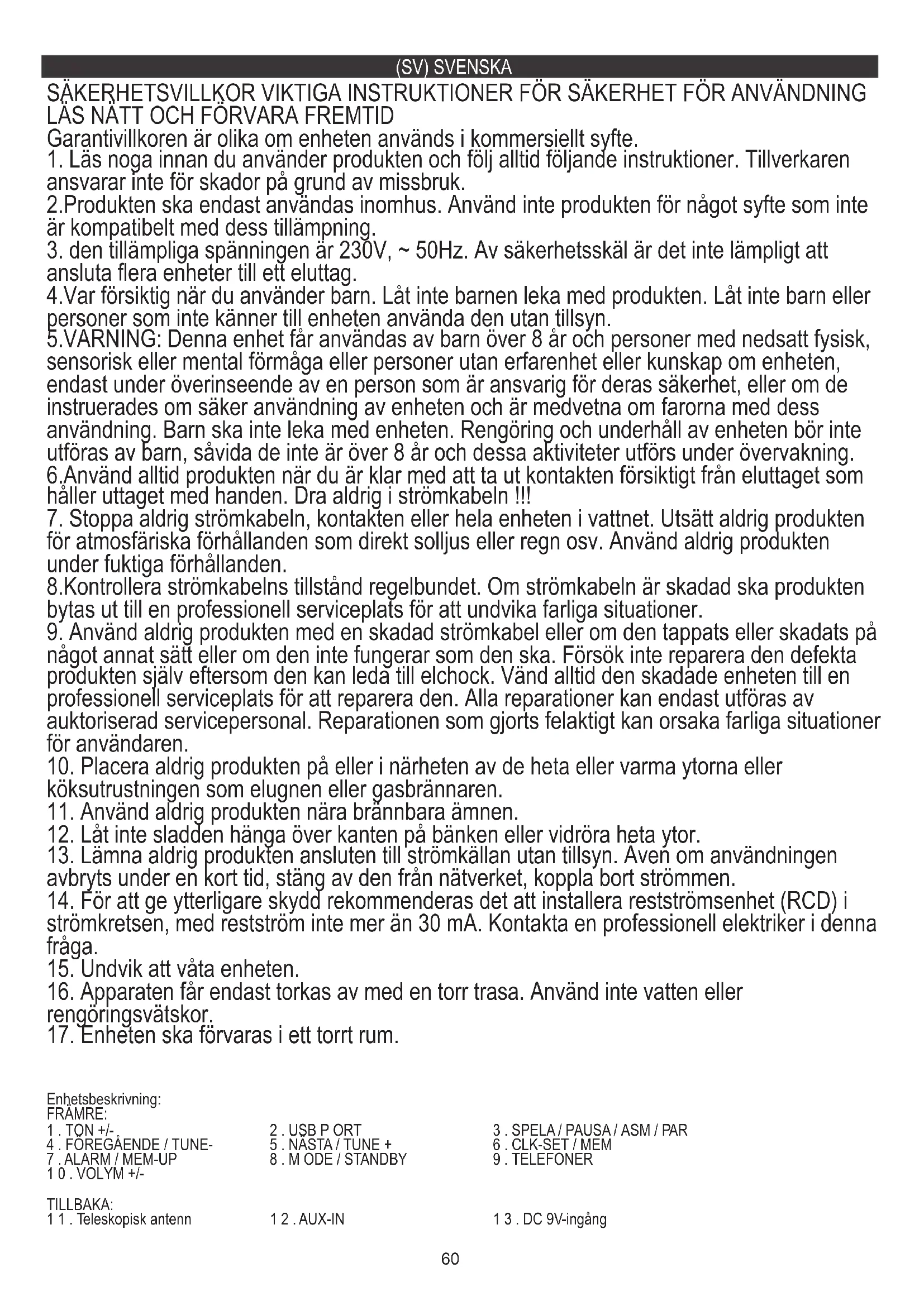 1 0 . VOLYM +/- TILLBAKA: 1 1 . Teleskopisk antenn 1 2 . AUX-IN 1 3 . DC 9V-ingång (SV) SVENSKA61 S KONFIGURERA Anslut nätadaptern till elnätet och strömuttaget på baksidan av radion ( DC 9V ). Förläng radioantennen helt i vertikalt läge för att få maximal signalstyrka. När strömmen är ansluten visas klockan 00:00 på LCD- skärmen. L ong tryck på MODE / STANDBY (8) för att aktivera enheten. (Denna process kan ta några minuter beror på olika signalstyrka och arbetsmiljö.) Klockan är som standard 0:00 Larmet är som standard 0:00 och av