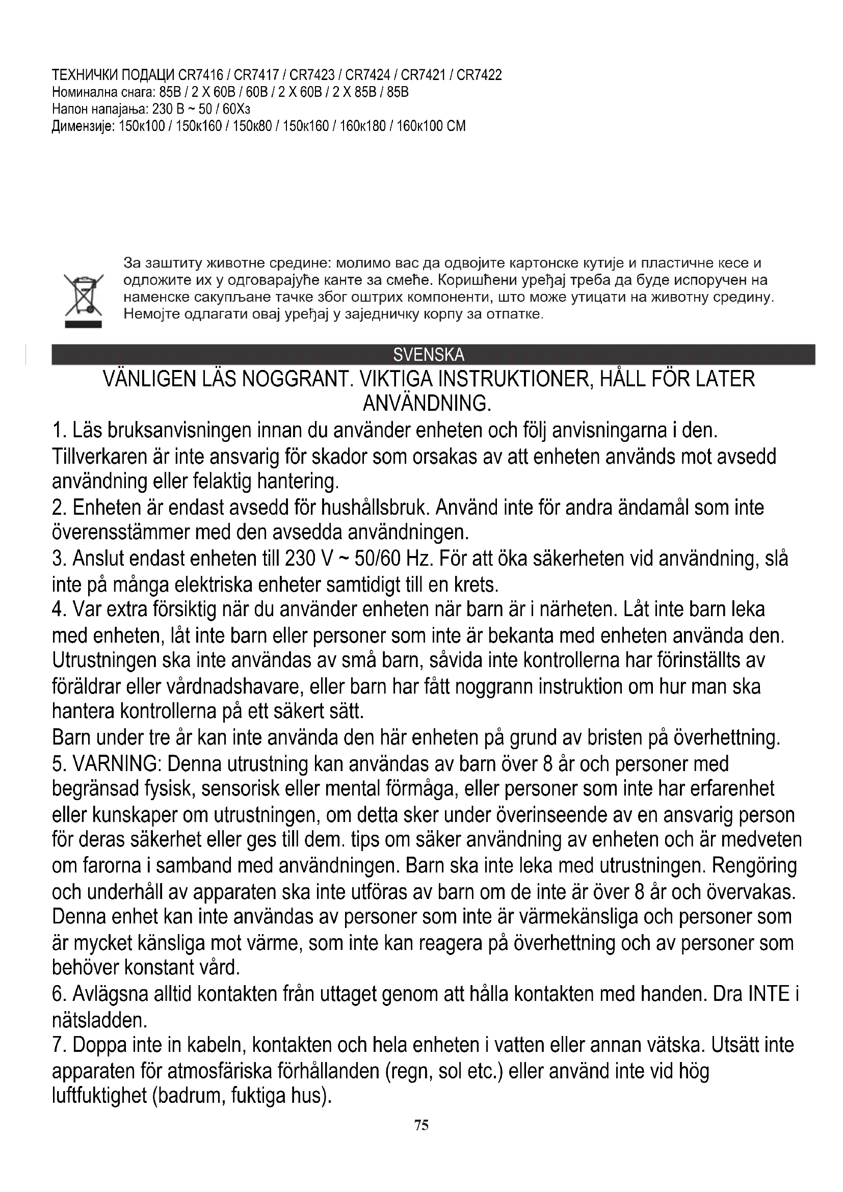 används i enlighet med den avsedda användningen av utrustningen. Om säkringen går, kommer anordningen att sluta fungera, maskinen måste returneras till tillverkaren eller dess representant för reparation. Produkt: Elektrisk filtunderlag CR7416 / CR7417 / CR7423 / CR7424 / CR7421 / Cr7422