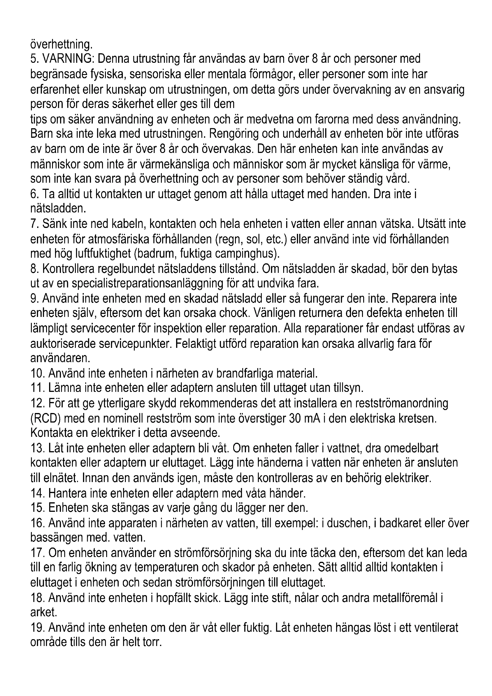 begränsade fysiska, sensoriska eller mentala förmågor, eller personer som inte har erfarenhet eller kunskap om utrustningen, om detta görs under övervakning av en ansvarig person för deras säkerhet eller ges till dem tips om säker användning av enheten och är medvetna om farorna med dess användning. Barn ska inte leka med utrustningen. Rengöring och underhåll av enheten bör inte utföras av barn om de inte är över 8 år och övervakas. Den här enheten kan inte användas av människor som inte är värmekänsliga och människor som är mycket känsliga för värme, som inte kan svara på överhettning och av personer som behöver ständig vård.