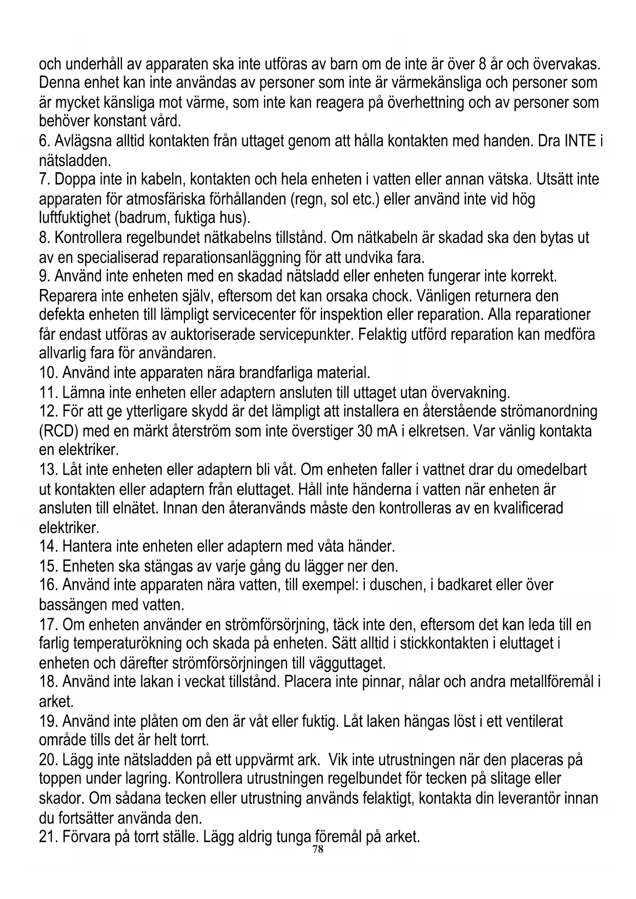19. Använd inte plåten om den är våt eller fuktig. Låt laken hängas löst i ett ventilerat