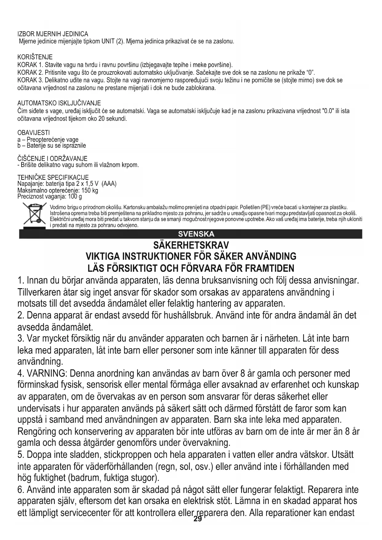 Torka vågen med en torr eller lite fuktig trasa. TEKNISKA DATA Strömning: batterityp 2 x 1,5 V (AAA) Kapacitet: 150 kg Mätnoggrannhet: 100 g Vi sköter om miljön. Överlämna förpackningar i kartong till pappersavfall. Polyetylensäckar (PE) slängs i avfallsbehållare för plast. Man bör lämna en gammal apparat till en riktig återvinningscentral, eftersom farliga komponenter i apparaten kan orsaka fara till miljön. En elektrisk apparat bör lämnas för att minska förnyad användning av denna. Om apparaten innehåller batterier, bör man ta bort dem och lämna dem separat till
