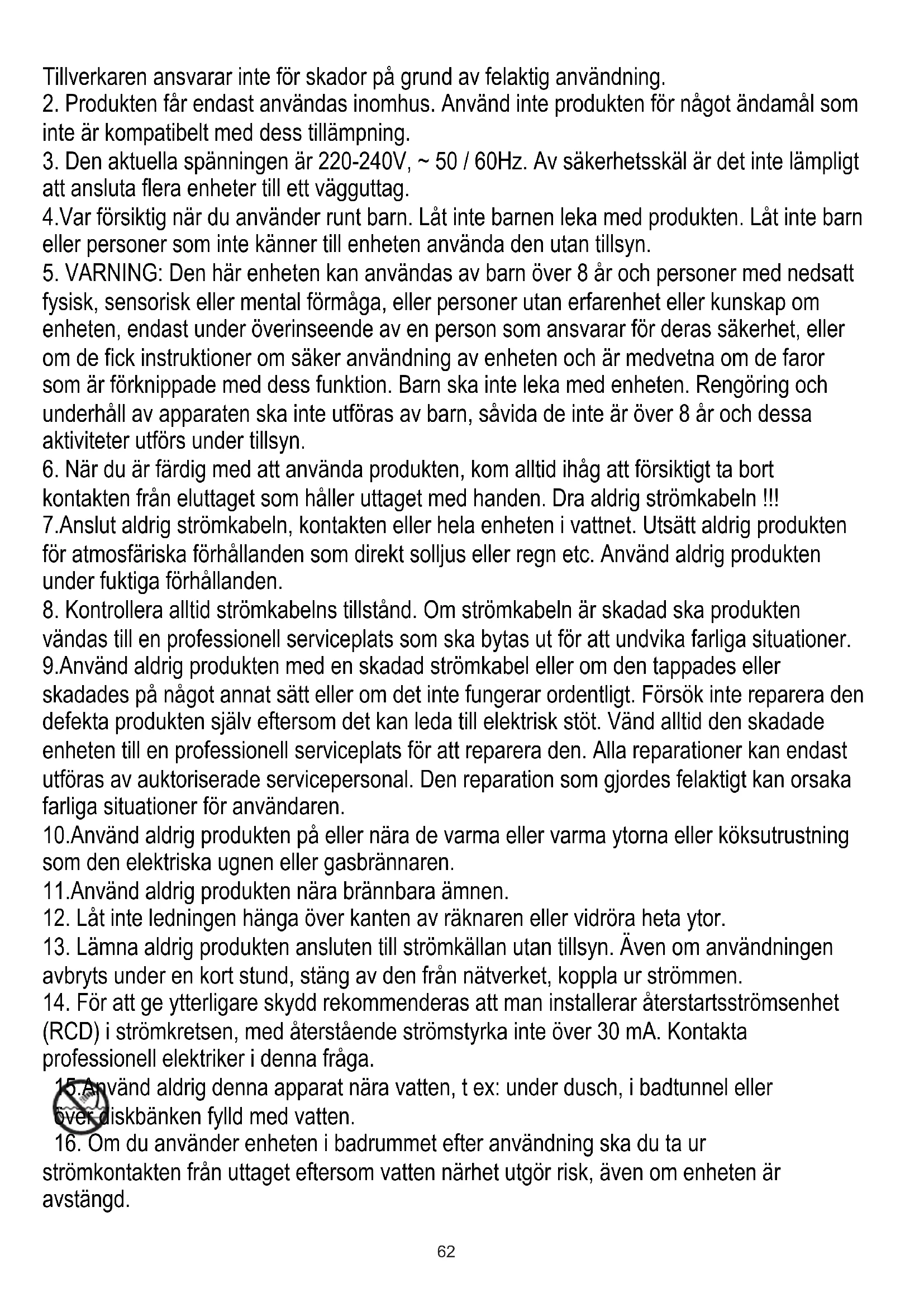 (RCD) i strömkretsen, med återstående strömstyrka inte över 30 mA. Kontakta professionell elektriker i denna fråga. 15.Använd aldrig denna apparat nära vatten, t ex: under dusch, i badtunnel eller över diskbänken fylld med vatten.