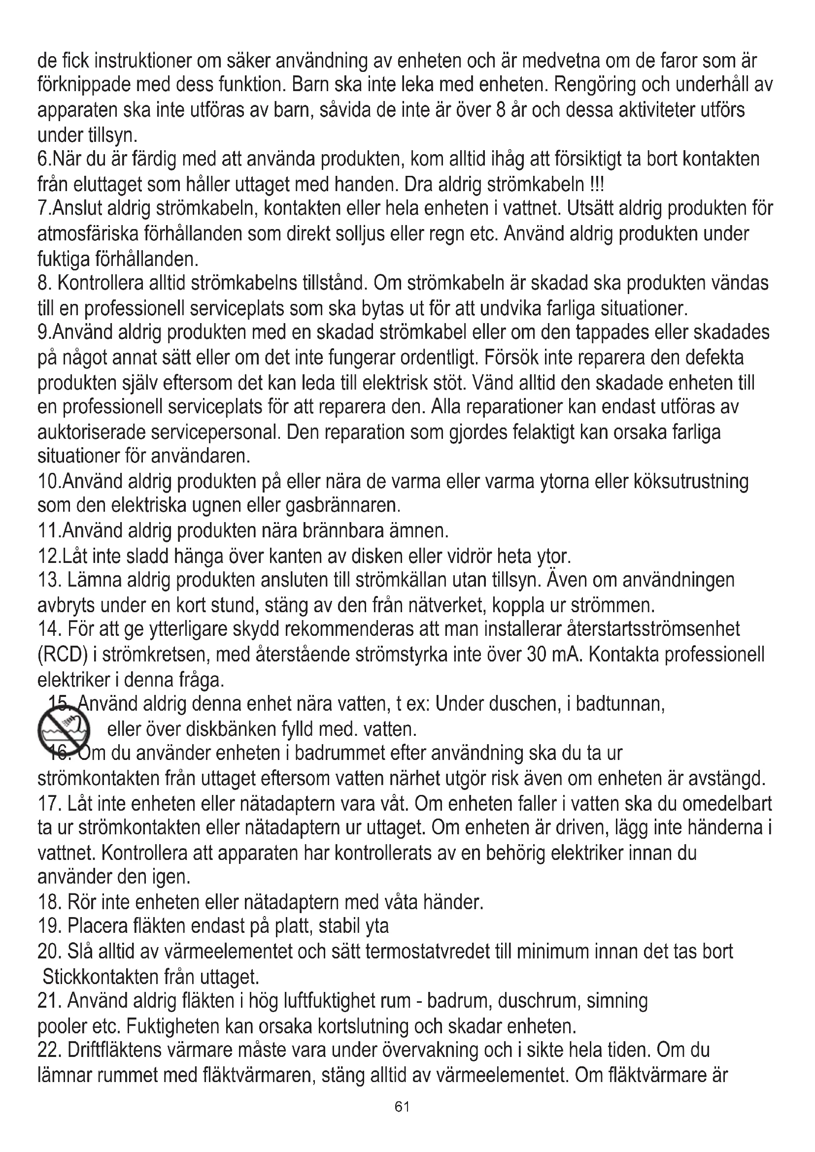 fysisk, sensorisk eller mental förmåga, eller personer utan erfarenhet eller kunskap om enheten, endast under överinseende av en person som ansvarar för deras säkerhet, eller om61 de fick instruktioner om säker användning av enheten och är medvetna om de faror som är förknippade med dess funktion. Barn ska inte leka med enheten. Rengöring och underhåll av apparaten ska inte utföras av barn, såvida de inte är över 8 år och dessa aktiviteter utförs under tillsyn. 6.När du är färdig med att använda produkten, kom alltid ihåg att försiktigt ta bort kontakten från eluttaget som håller uttaget med handen. Dra aldrig strömkabeln !!! 7.Anslut aldrig strömkabeln, kontakten eller hela enheten i vattnet. Utsätt aldrig produkten för atmosfäriska förhållanden som direkt solljus eller regn etc. Använd aldrig produkten under fuktiga förhållanden.