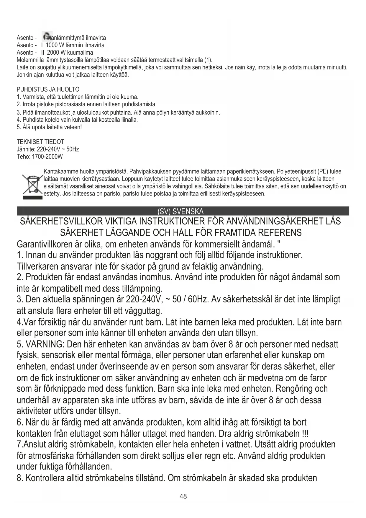 fysisk, sensorisk eller mental förmåga, eller personer utan erfarenhet eller kunskap om enheten, endast under överinseende av en person som ansvarar för deras säkerhet, eller om de fick instruktioner om säker användning av enheten och är medvetna om de faror som är förknippade med dess funktion. Barn ska inte leka med enheten. Rengöring och underhåll av apparaten ska inte utföras av barn, såvida de inte är över 8 år och dessa aktiviteter utförs under tillsyn.