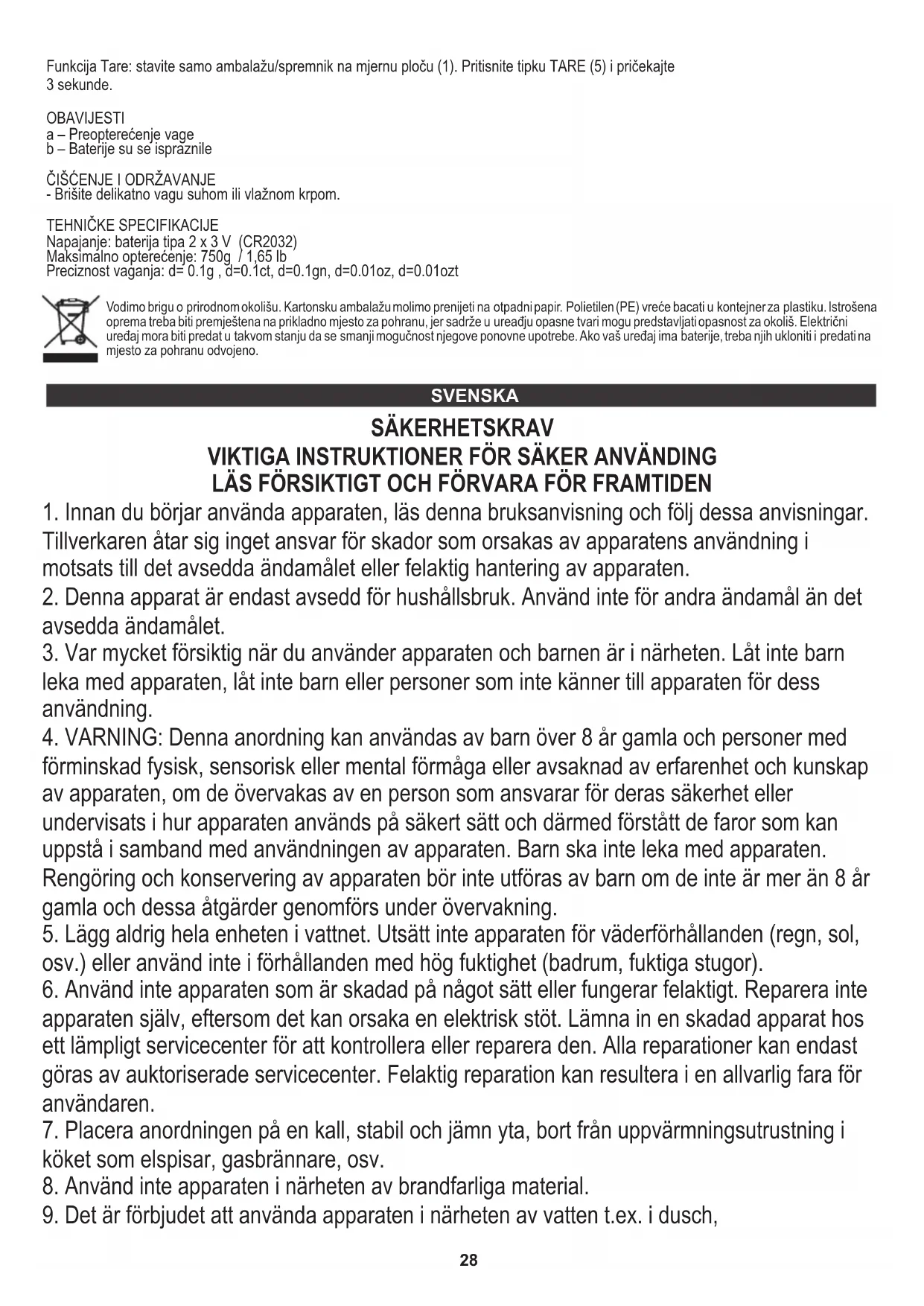 Mätnoggrannhet: d= 0.1g , d=0.1ct, d=0.1gn, d=0.01oz, d=0.01ozt Torka vågen med en torr eller lite fuktig trasa. Kapacitet: 750g / 1,65 lb b - låg batterinivå Vi sköter om miljön. Överlämna förpackningar i kartong till pappersavfall. Polyetylensäckar (PE) slängs i avfallsbehållare för plast. Man bör lämna en gammal apparat till en riktig återvinningscentral, eftersom farliga komponenter i apparaten kan orsaka fara till miljön. En elektrisk apparat bör lämnas för att minska förnyad användning av denna. Om apparaten innehåller batterier, bör man ta bort dem och lämna dem separat till återvinningscentraler. ITALIANO