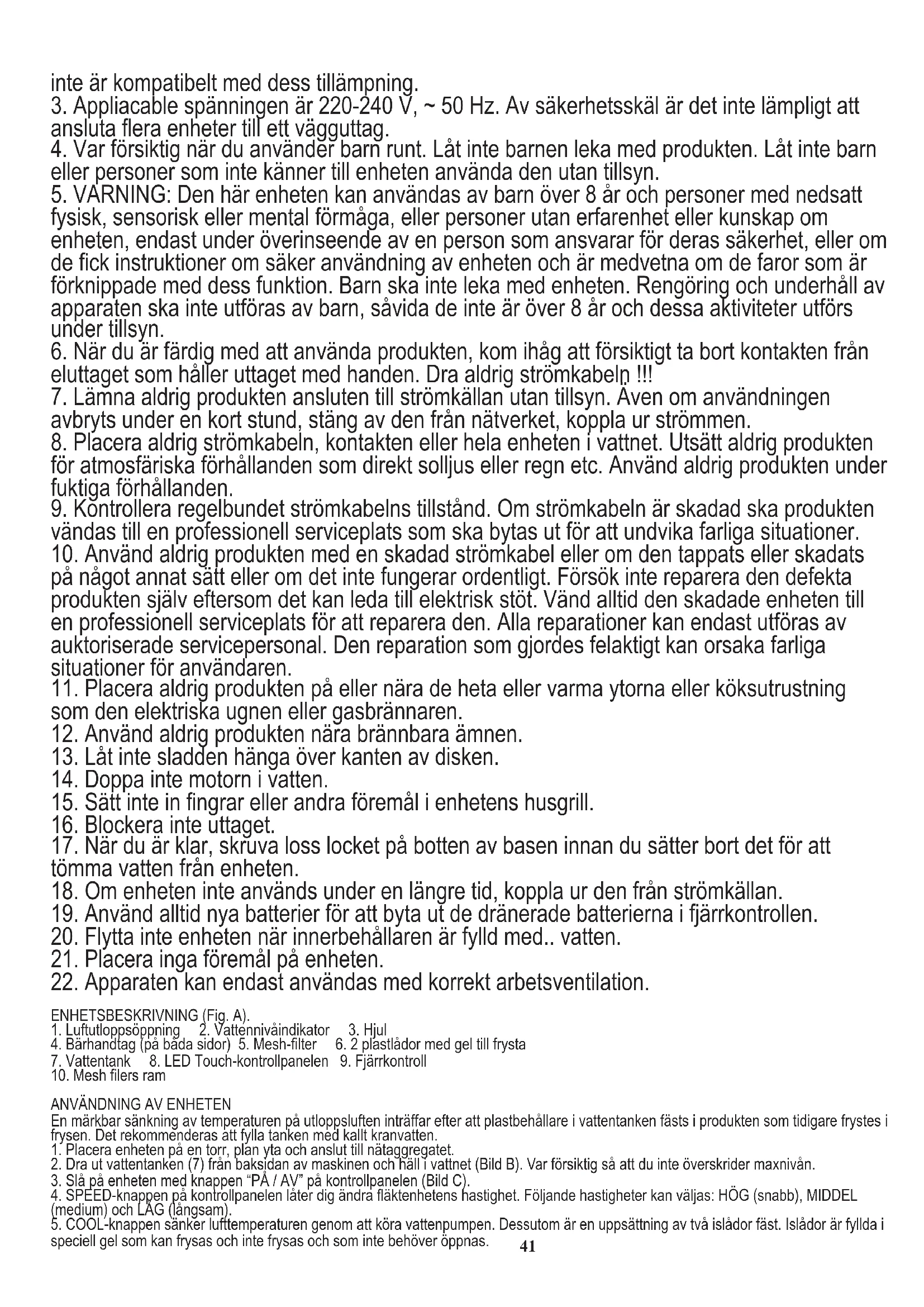 fysisk, sensorisk eller mental förmåga, eller personer utan erfarenhet eller kunskap om enheten, endast under överinseende av en person som ansvarar för deras säkerhet, eller om de fick instruktioner om säker användning av enheten och är medvetna om de faror som är förknippade med dess funktion. Barn ska inte leka med enheten. Rengöring och underhåll av apparaten ska inte utföras av barn, såvida de inte är över 8 år och dessa aktiviteter utförs under tillsyn.
