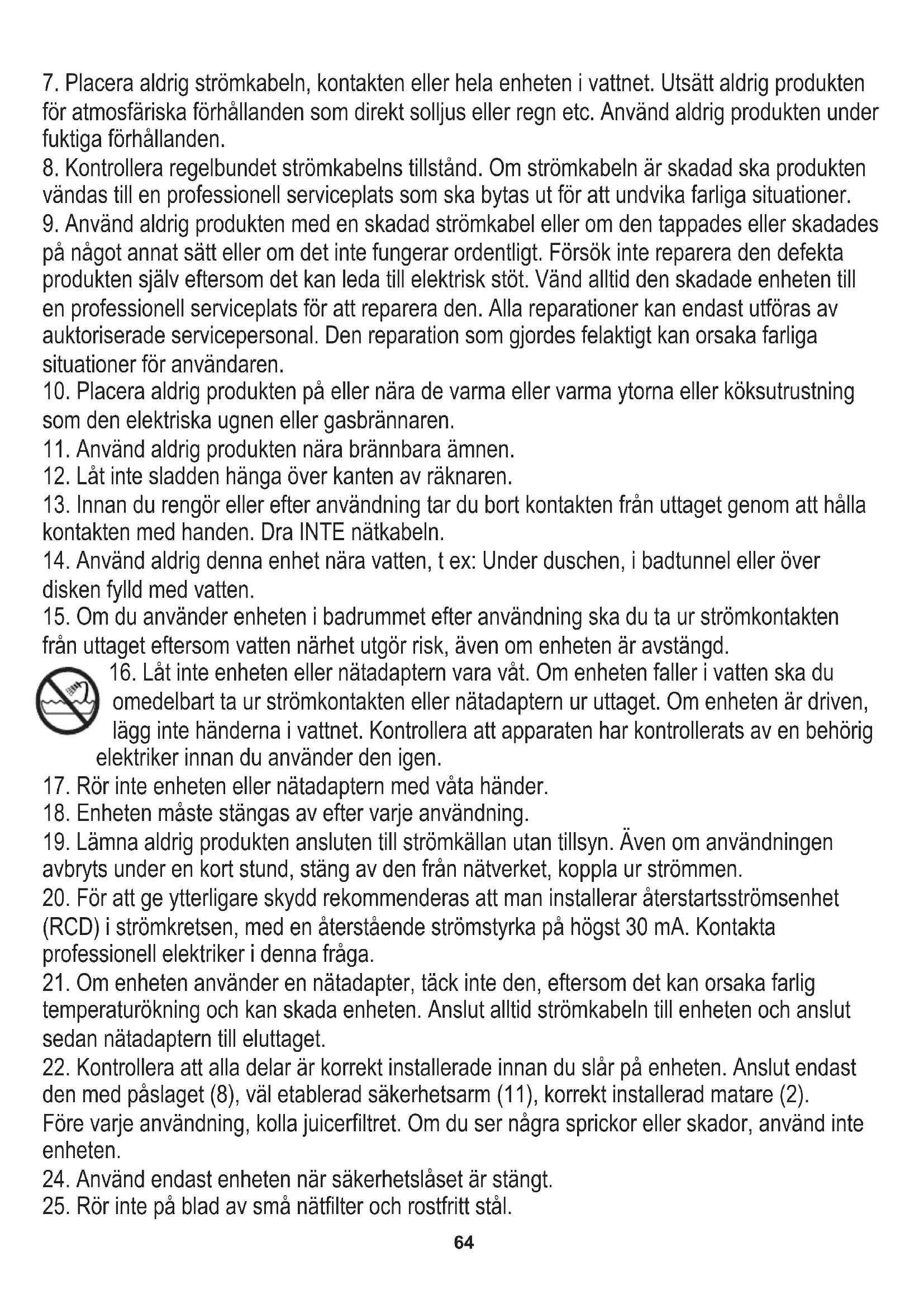 14. Använd aldrig denna enhet nära vatten, t ex: Under duschen, i badtunnel eller över