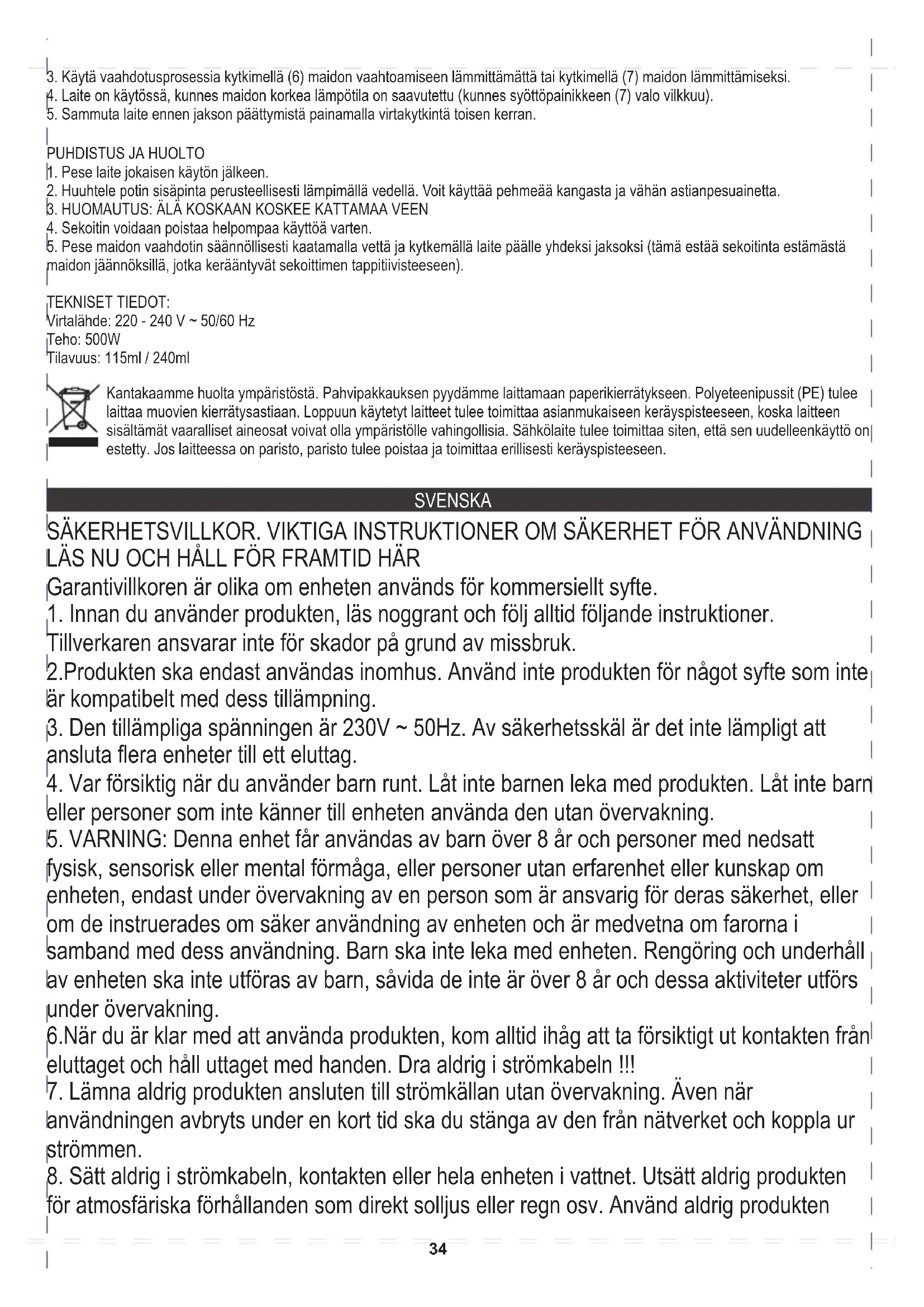 TEKNISK DATA: Kapacitet: 115 ml / 240 ml Effekt: 500W