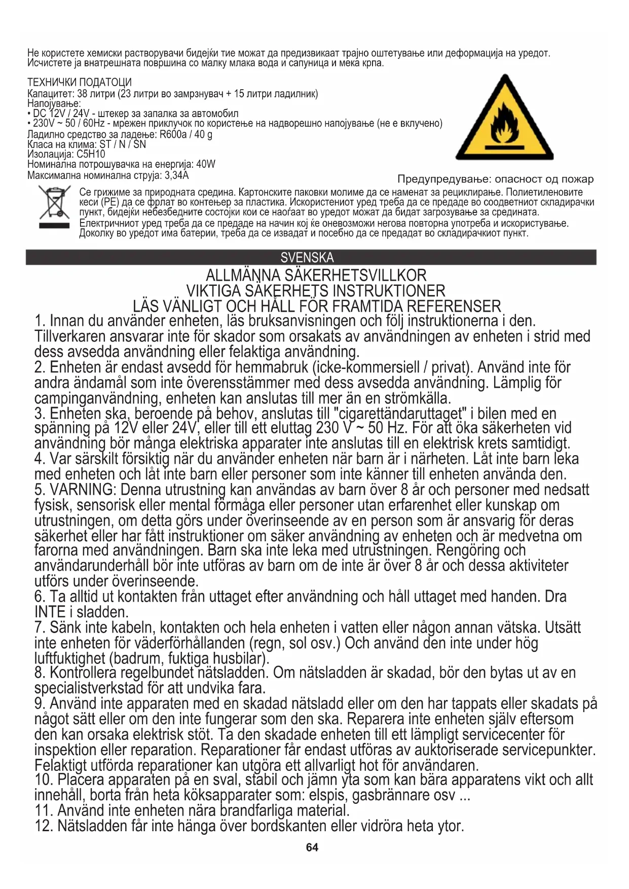iné účely, ktoré nie sú v súlade s jeho určením. Jednotka je vhodná na použitie v kempingu Varning: brandrisk Vi sköter om miljön. Överlämna förpackningar i kartong till pappersavfall. Polyetylensäckar (PE) slängs i avfallsbehållare för plast. Man bör lämna en gammal apparat till en riktig återvinningscentral,eftersom farliga komponenter i apparaten kan orsaka fara till miljön. En elektrisk apparat bör lämnas för att minska förnyad användning av denna. Om apparaten innehåller batterier, bör man ta bort dem och lämna dem separat till återvinningscentraler.67 - VAROVANIE: Vo vnútri priehradky na potraviny nepoužívajte elektrické zariadenia iného typu, ako odporúča výrobca. a môže byť pripojená k viac ako jednému zdroju napájania.