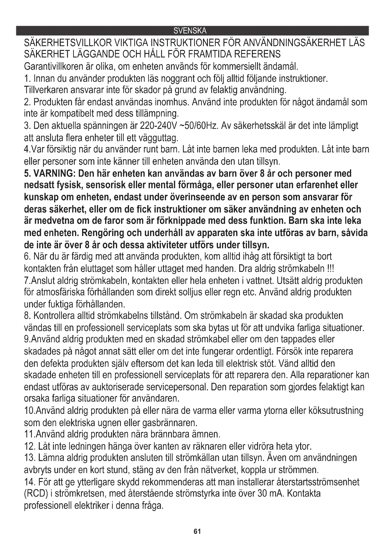 nedsatt fysisk, sensorisk eller mental förmåga, eller personer utan erfarenhet eller kunskap om enheten, endast under överinseende av en person som ansvarar för deras säkerhet, eller om de fick instruktioner om säker användning av enheten och är medvetna om de faror som är förknippade med dess funktion. Barn ska inte leka med enheten. Rengöring och underhåll av apparaten ska inte utföras av barn, såvida de inte är över 8 år och dessa aktiviteter utförs under tillsyn.62