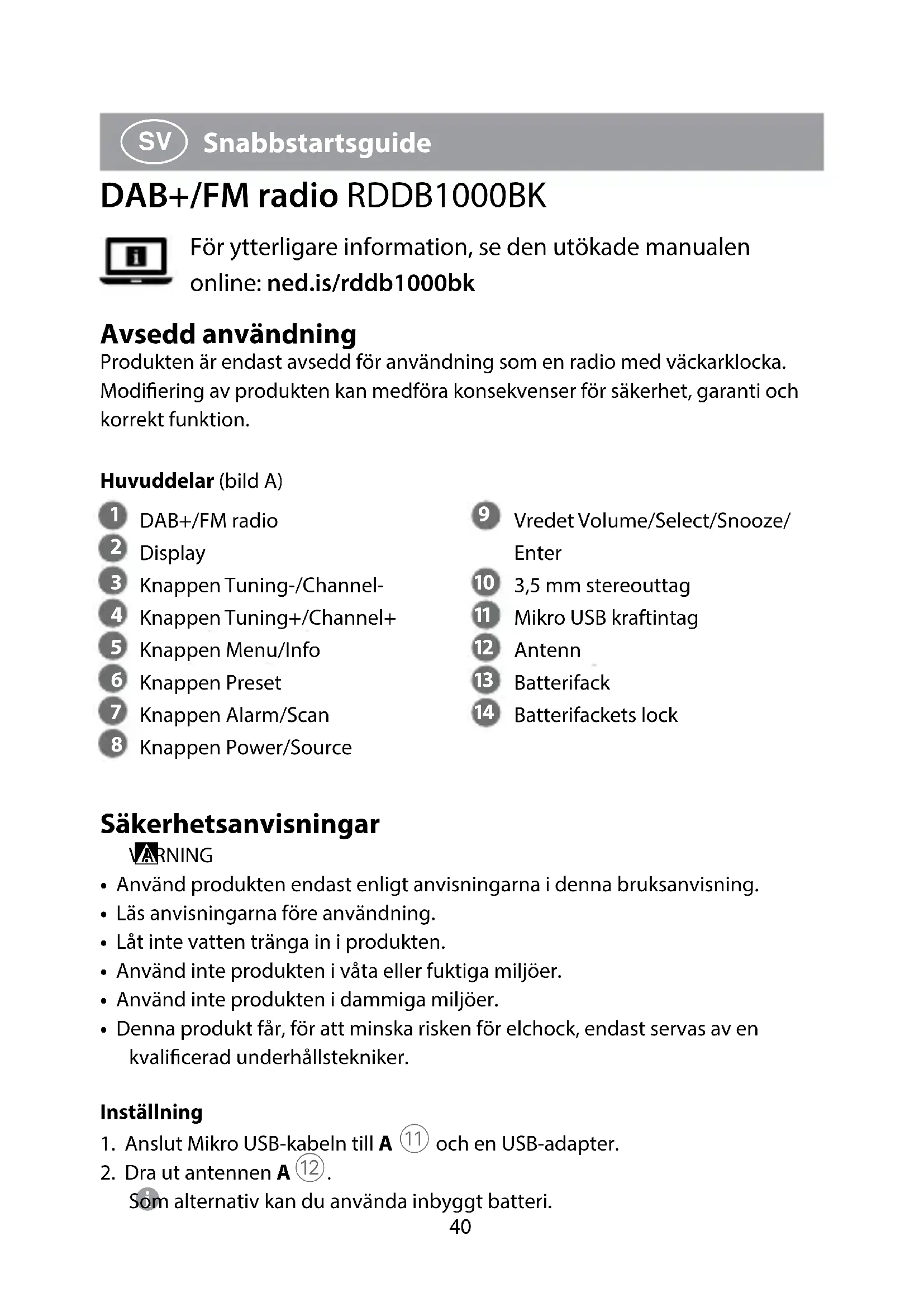 Snabbstartsguide DAB+/FM radio RDDB1000BK För ytterligare information, se den utökade manualen online: ned.is/rddb1000bk Avsedd användning Produkten är endast avsedd för användning som en radio med väckarklocka.Modiering av produkten kan medföra konsekvenser för säkerhet, garanti och korrekt funktion.Huvuddelar (bild A) DAB+/FM radio Display Knappen Tuning-/Channel- Knappen Tuning+/Channel+ Knappen Menu/Info Knappen Preset Knappen Alarm/Scan Knappen Power/Source Vredet Volume/Select/Snooze/Enter 3,5 mm stereouttag Mikro USB kraftintag Antenn Batterifack Batterifackets lock Säkerhetsanvisningar