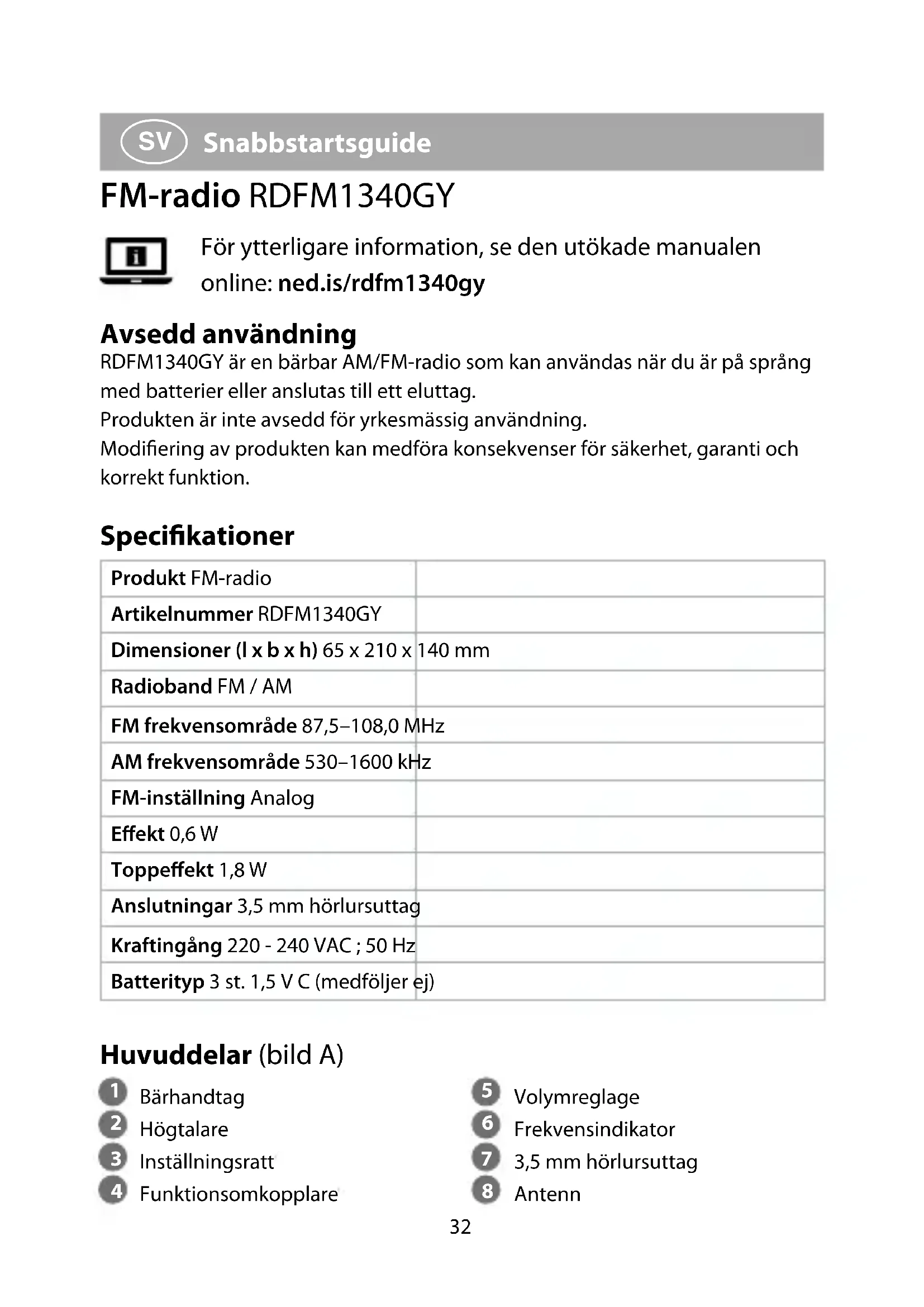 Snabbstartsguide FM-radio RDFM1340GY För ytterligare information, se den utökade manualen online: ned.is/rdfm1340gy Avsedd användning RDFM1340GY är en bärbar AM/FM-radio som kan användas när du är på språng med batterier eller anslutas till ett eluttag. Produkten är inte avsedd för yrkesmässig användning. Modiering av produkten kan medföra konsekvenser för säkerhet, garanti och korrekt funktion. Specikationer Produkt FM-radio Artikelnummer RDFM1340GY Dimensioner (l x b x h) 65 x 210 x 140 mm Radioband FM / AM FM frekvensområde 87,5–108,0 MHz AM frekvensområde 530–1600 kHz FM-inställning Analog Eekt 0,6 W Toppeekt 1,8 W Anslutningar 3,5 mm hörlursuttag Kraftingång 220 - 240 VAC ; 50 Hz Batterityp 3 st. 1,5 V C (medföljer ej) Huvuddelar (bild A)