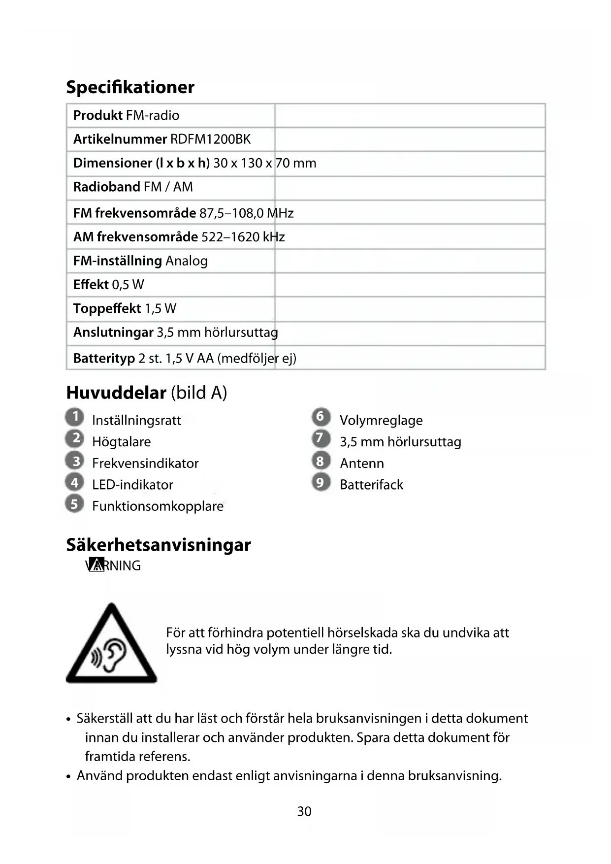 Snabbstartsguide FM-radio RDFM1200BK För ytterligare information, se den utökade manualen online: ned.is/rdfm1200bk Avsedd användning RDFM1200BK är en bärbar AM/FM-radio som kan användas när du är på språng med batterier eller anslutas till ett eluttag.Produkten är inte avsedd för yrkesmässig användning.Modiering av produkten kan medföra konsekvenser för säkerhet, garanti och korrekt funktion.30 Specikationer Produkt FM-radio Artikelnummer RDFM1200BK Dimensioner (l x b x h) 30 x 130 x 70 mm Radioband FM / AM FM frekvensområde 87,5–108,0 MHz AM frekvensområde 522–1620 kHz FM-inställning Analog Eekt 0,5 W Toppeekt 1,5 W Anslutningar 3,5 mm hörlursuttag Batterityp 2 st. 1,5 V AA (medföljer ej) Huvuddelar (bild A)