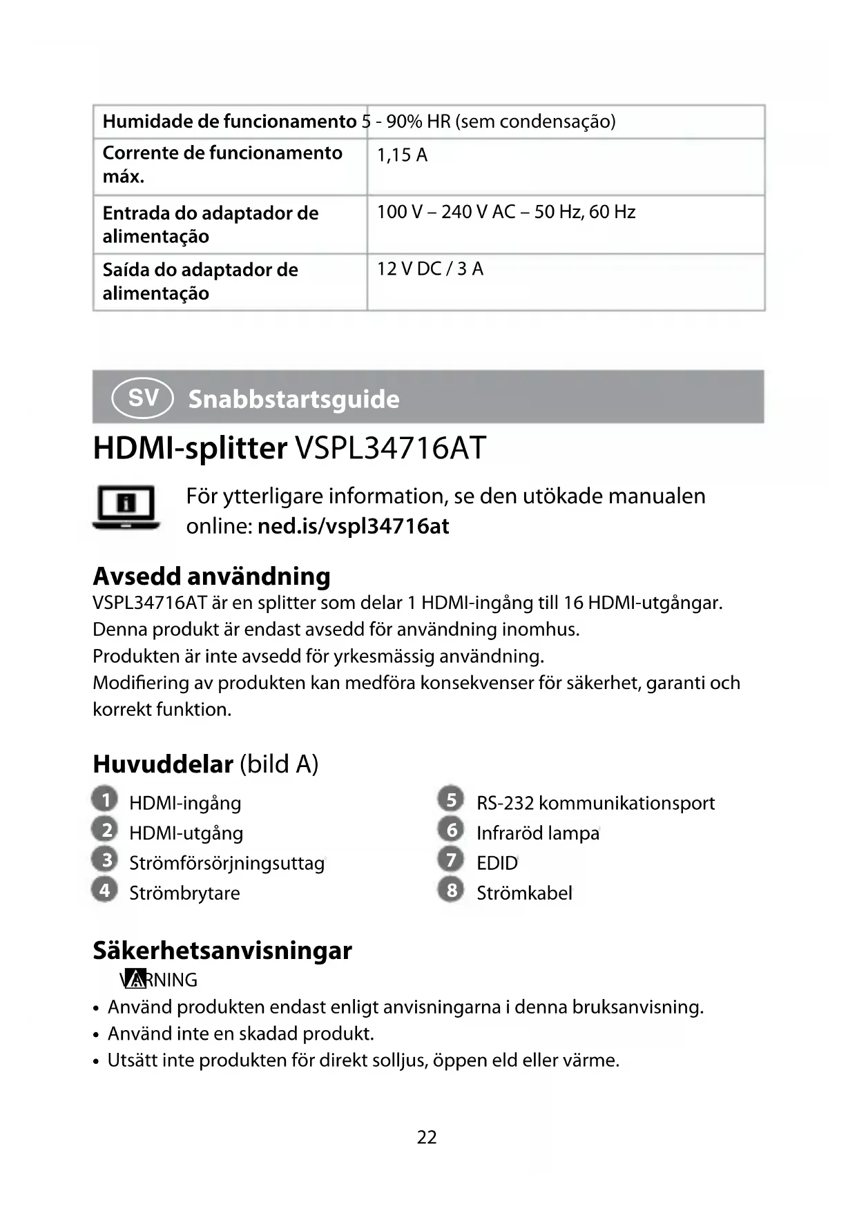Snabbstartsguide HDMI-splitter VSPL34716AT För ytterligare information, se den utökade manualen online: ned.is/vspl34716at Avsedd användning VSPL34716AT är en splitter som delar 1 HDMI-ingång till 16 HDMI-utgångar.Denna produkt är endast avsedd för användning inomhus.Produkten är inte avsedd för yrkesmässig användning.Modifiering av produkten kan medföra konsekvenser för säkerhet, garanti och korrekt funktion. Huvuddelar (bild A)