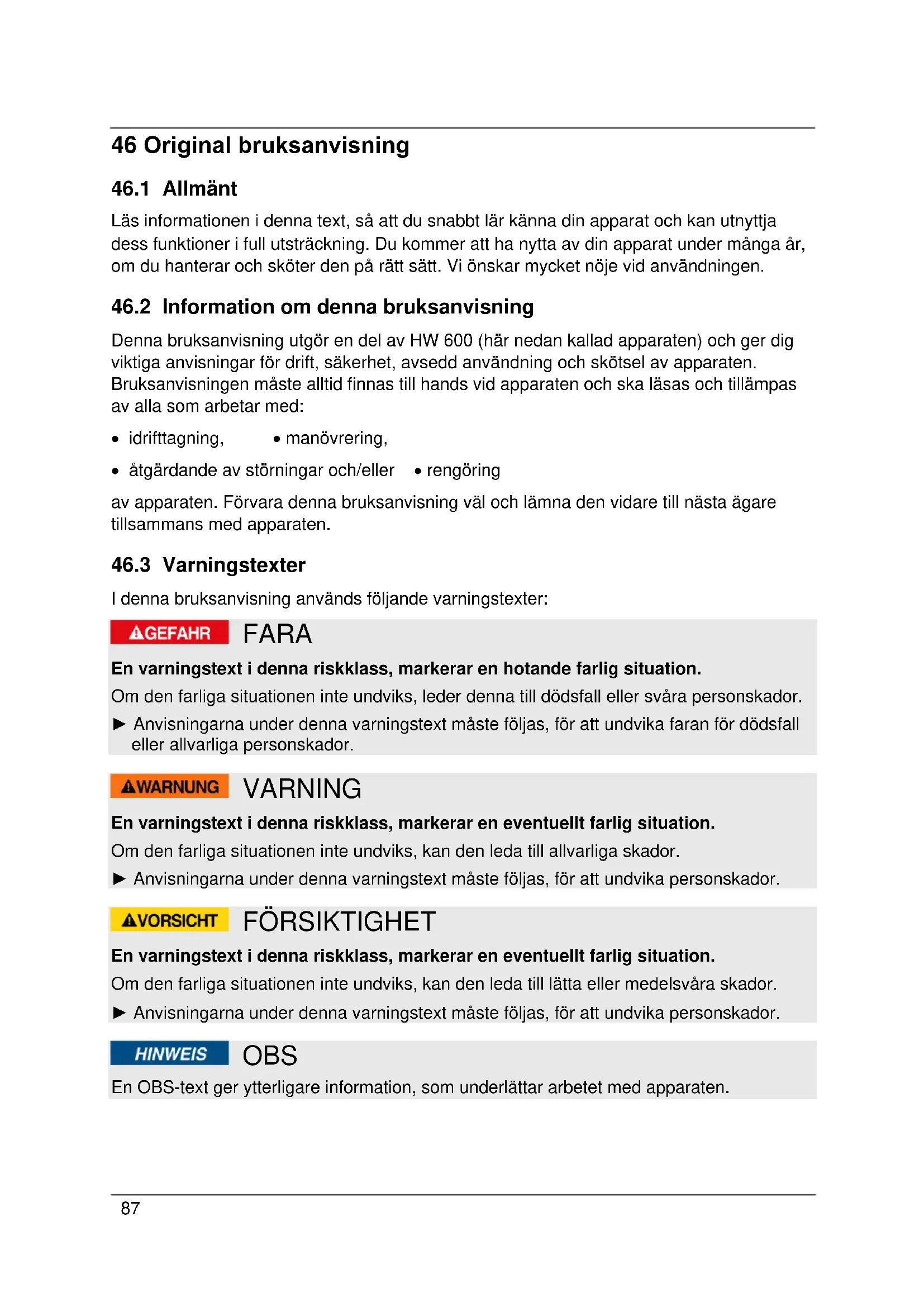 I denna bruksanvisning används följande varningstexter: FARA En varningstext i denna riskklass, markerar en hotande farlig situation. Om den farliga situationen inte undviks, leder denna till dödsfall eller svåra personskador. ► Anvisningarna under denna varningstext måste följas, för att undvika faran för dödsfall eller allvarliga personskador. VARNING En varningstext i denna riskklass, markerar en eventuellt farlig situation. Om den farliga situationen inte undviks, kan den leda till allvarliga skador. ► Anvisningarna under denna varningstext måste följas, för att undvika personskador. FÖRSIKTIGHET En varningstext i denna riskklass, markerar en eventuellt farlig situation. Om den farliga situationen inte undviks, kan den leda till lätta eller medelsvåra skador. ► Anvisningarna under denna varningstext måste följas, för att undvika personskador. OBS En OBS-text ger ytterligare information, som underlättar arbetet med apparaten.88