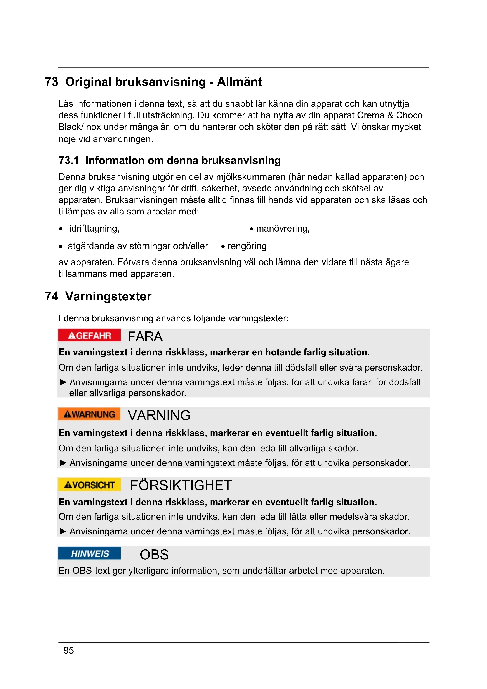Denna bruksanvisning utgör en del av mjölkskummaren (här nedan kallad apparaten) och ger dig viktiga anvisningar för drift, säkerhet, avsedd användning och skötsel av apparaten. Bruksanvisningen måste alltid finnas till hands vid apparaten och ska läsas och tillämpas av alla som arbetar med: idrifttagning, manövrering, åtgärdande av störningar och/eller rengöring av apparaten. Förvara denna bruksanvisning väl och lämna den vidare till nästa ägare tillsammans med apparaten. 74 Varningstexter I denna bruksanvisning används följande varningstexter: FARA En varningstext i denna riskklass, markerar en hotande farlig situation. Om den farliga situationen inte undviks, leder denna till dödsfall eller svåra personskador. ► Anvisningarna under denna varningstext måste följas, för att undvika faran för dödsfall eller allvarliga personskador. VARNING En varningstext i denna riskklass, markerar en eventuellt farlig situation. Om den farliga situationen inte undviks, kan den leda till allvarliga skador. ► Anvisningarna under denna varningstext måste följas, för att undvika personskador. FÖRSIKTIGHET En varningstext i denna riskklass, markerar en eventuellt farlig situation. Om den farliga situationen inte undviks, kan den leda till lätta eller medelsvåra skador. ► Anvisningarna under denna varningstext måste följas, för att undvika personskador. OBS En OBS-text ger ytterligare information, som underlättar arbetet med apparaten.96 75 Säkerhet I detta avsnitt får du viktiga säkerhetsanvisningar för arbetet med apparaten. Denna apparat svarar mot föreskrivna säkerhetsbestämmelser. En felaktig användning kan emellertid leda till person- och egendomsskador.