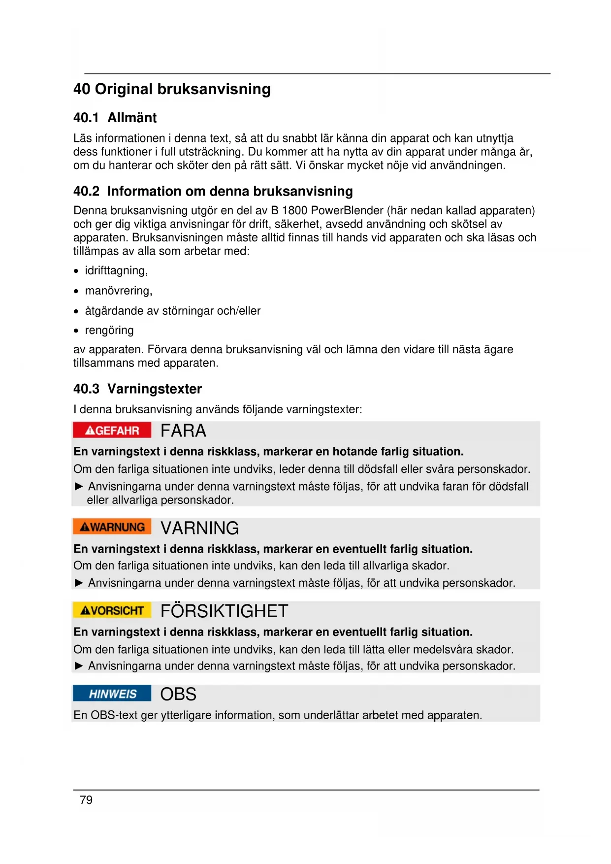 I denna bruksanvisning används följande varningstexter: FARA En varningstext i denna riskklass, markerar en hotande farlig situation. Om den farliga situationen inte undviks, leder denna till dödsfall eller svåra personskador. ► Anvisningarna under denna varningstext måste följas, för att undvika faran för dödsfall eller allvarliga personskador. VARNING En varningstext i denna riskklass, markerar en eventuellt farlig situation. Om den farliga situationen inte undviks, kan den leda till allvarliga skador. ► Anvisningarna under denna varningstext måste följas, för att undvika personskador. FÖRSIKTIGHET En varningstext i denna riskklass, markerar en eventuellt farlig situation. Om den farliga situationen inte undviks, kan den leda till lätta eller medelsvåra skador. ► Anvisningarna under denna varningstext måste följas, för att undvika personskador. OBS En OBS-text ger ytterligare information, som underlättar arbetet med apparaten.80
