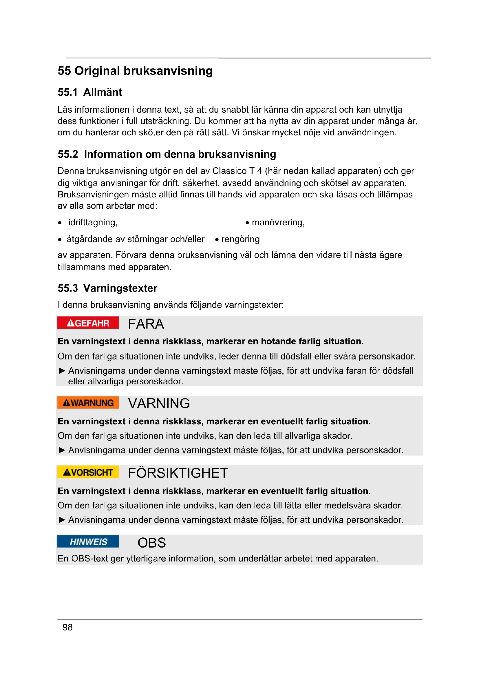 I denna bruksanvisning används följande varningstexter: FARA En varningstext i denna riskklass, markerar en hotande farlig situation. Om den farliga situationen inte undviks, leder denna till dödsfall eller svåra personskador. ► Anvisningarna under denna varningstext måste följas, för att undvika faran för dödsfall eller allvarliga personskador. VARNING En varningstext i denna riskklass, markerar en eventuellt farlig situation. Om den farliga situationen inte undviks, kan den leda till allvarliga skador. ► Anvisningarna under denna varningstext måste följas, för att undvika personskador. FÖRSIKTIGHET En varningstext i denna riskklass, markerar en eventuellt farlig situation. Om den farliga situationen inte undviks, kan den leda till lätta eller medelsvåra skador. ► Anvisningarna under denna varningstext måste följas, för att undvika personskador. OBS En OBS-text ger ytterligare information, som underlättar arbetet med apparaten.99