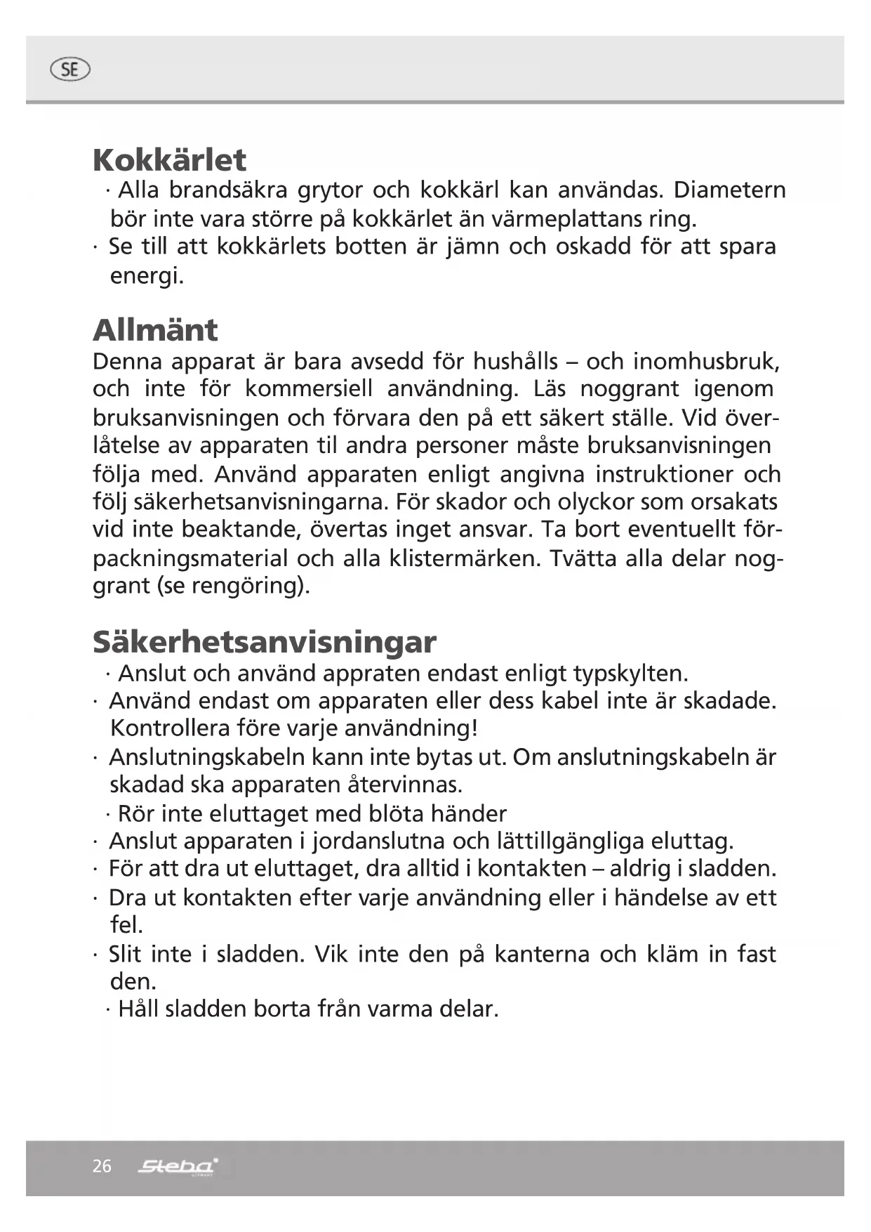 Laat nooit lege potten of pannen op de kookplaat staan. ∙ Als u klaar bent met koken, zet u de schakelaar op „0“ en haalt u de stekker uit het stopcontact.25 Correcte afvalverwijdering van dit product Versleten apparaten onmiddellijk onbruikbaar maken. Binnen de Europese Unie duidt dit symbool erop dat dit product niet samen met huishoudelijk afval verwijderd mag worden. Oude apparaten bevatten waardevolle, recycleerbare materialen, die aan recycling onderworpen moe- ten worden om het milieu c.q. de menselijke gezondheid niet door een onge- controleerde afvalverwijdering te schaden. Gelieve oude apparaten daarom via ge- schikte inzamelsystemen te verwijderen of het apparaat met het oog op de afvalverwijdering terug naar de afzender (waar u het product gekocht hebt) te zen- den. De afzender zal dan het apparaat aan een stoffelijke recycling onderwerpen. Evacuatie van de verpakking Verpakkingsmateriaal niet gewoon wegwerpen, maar aan recycling onderwerpen. Verpakkingen van papier, karton en gegolfd karton in verzamelcentra voor oud pa- pier afgeven. Onderdelen van kunststofverpakkingen en folie dienen eveneens in de daarvoor bestemde verzamelbakken gedeponeerd te worden. In de voorbeelden voor de kunststofbenaming staat: PE voor poly- ethyleen, het kencijfer 02 voor PE-HD, 04 voor PE-LD, PP voor poly- propyleen, PS voor polystyreen. Klantenserviceafdeling: Indien uw apparaat tegen de verwachting in dan toch al eens de klantenserviceaf- deling nodig heeft, gelieve u dan tot onderstaand adres te richten. Wij zullen dan in geval van garantie voor de afhaling zorgen. Het apparaat moet transporteerbaar verpakt zijn. Ongefrankeerde pakjes kunnen niet aanvaard worden! STEBA Elektrogeräte GmbH & Co KG Pointstr. 2, 96129 Strullendorf / Germany Verkopen-Tel.: 09543 / 449-17 / -18, Service-Tel.: 09543 / 449-44, Fax: 09543 / 449-19 e-Mail: elektro@steba.com Internet: http://www.steba.com Opgelet! Elektrische apparaten mogen uitsluitend door vakkundig geschoolde elek- triciens gerepareerd worden, omdat er door ondeskundige reparaties aanzienlijke gevolgschade kan ontstaan.26 Kokkärlet ∙ Alla brandsäkra grytor och kokkärl kan användas. Diametern bör inte vara större på kokkärlet än värmeplattans ring. ∙ Se till att kokkärlets botten är jämn och oskadd för att spara energi. Allmänt Denna apparat är bara avsedd för hushålls – och inomhusbruk, och inte för kommersiell användning. Läs noggrant igenom bruksanvisningen och förvara den på ett säkert ställe. Vid över- låtelse av apparaten til andra personer måste bruksanvisningen följa med. Använd apparaten enligt angivna instruktioner och följ säkerhetsanvisningarna. För skador och olyckor som orsakats vid inte beaktande, övertas inget ansvar. Ta bort eventuellt för- packningsmaterial och alla klistermärken. Tvätta alla delar nog- grant (se rengöring). Säkerhetsanvisningar ∙ Anslut och använd appraten endast enligt typskylten. ∙ Använd endast om apparaten eller dess kabel inte är skadade. Kontrollera före varje användning! ∙ Anslutningskabeln kann inte bytas ut. Om anslutningskabeln är skadad ska apparaten återvinnas. ∙ Rör inte eluttaget med blöta händer ∙ Anslut apparaten i jordanslutna och lättillgängliga eluttag. ∙ För att dra ut eluttaget, dra alltid i kontakten – aldrig i sladden. ∙ Dra ut kontakten efter varje användning eller i händelse av ett fel. ∙ Slit inte i sladden. Vik inte den på kanterna och kläm in fast den. ∙ Håll sladden borta från varma delar.27 ∙ Apparaten får inte användas av barn mellan 0 och 8 år. Maskinen kan användas av barn över 8 år, samt av per- soner med nedsatt fysisk, sensorisk eller mental förmåga, el- ler med brist på erfarenhet och/eller kunskap när de överva- kas eller instrueras med anseende på säker användning av maskinen och har förstått resulterande faror. Rengöring och underhåll av användaren får inte utföras av barn, såvida de inte är äldre än 8 år och övervakas. ∙ Apparaten och dess kabel ska hållas borta från barn som är yn- gre än 8 år. ∙ Barn bör övervakas för att säkerställa att de inte leker med ap- paraten eller förpackningsmaterialet (t.ex. plastpåsar). ∙ Använd inte apparaten med extern timer eller annat separat kontrollsystem! ∙ Apparaten får inte användas utan tillsyn. ∙ Förvara inte apparaten utomhus eller i fuktiga rum. ∙ Sänk aldrig apparaten i vatten! ∙ Använd aldrig grillen om den har eller har haft funktionsfel, t.ex. efter att den har tappats eller skadats på något annat sätt. ∙ Tillverkaren påtar sig inget ansvar för felaktig användning, vil- ket orsakas av att bruksanvisningen inte har följts. ∙ För att undvika risk för skador, får eventuella skador på appa- raten, som t.ex. skadad strömledning osv. endast repareras ge- nom avsedd kundtjänst. Endast original reservdelar får använ- das. ∙ Apparaten blir varm och får endast transporteras efter kylning. ∙ Använd appraten endast för de ändamål som beskrivs i denna bruksanvisning. ∙ Apparaten är avsedd att användas i hushålls- och linknande mil- jöer så som: o I kök för anställda i affärer, kontor och andra företags- områden. o I jordbruksföretag och av anställda och kunder på hotell, motell eller andra övernattningsanläggningar. o På pensionat28 ∙ Varning! Apparaten blir het. Risk för brännska- dor! Under drift kan temperaturen på ytorna bli väl- digt hög! Placera inte apparaten på känsliga underlag och håll den minst 70 cm från brännbart material (t.ex. gardi- ner). ∙ Vid användning av förlängningskabel måste tvärsnittet vara 1,5 mm². ∙ Ett GS-testat 16 A eluttag får inte laddas med mer än 3680 watt på grund av brandrisk. ∙ Ha koll på sladden, barn får inte dra i den och det får inte uppstå risk för snubbling. ∙ Apparaten måste alltid kopplas ur eluttaget när den ska mon- teras, inte är under uppsikt eller vid rengöring