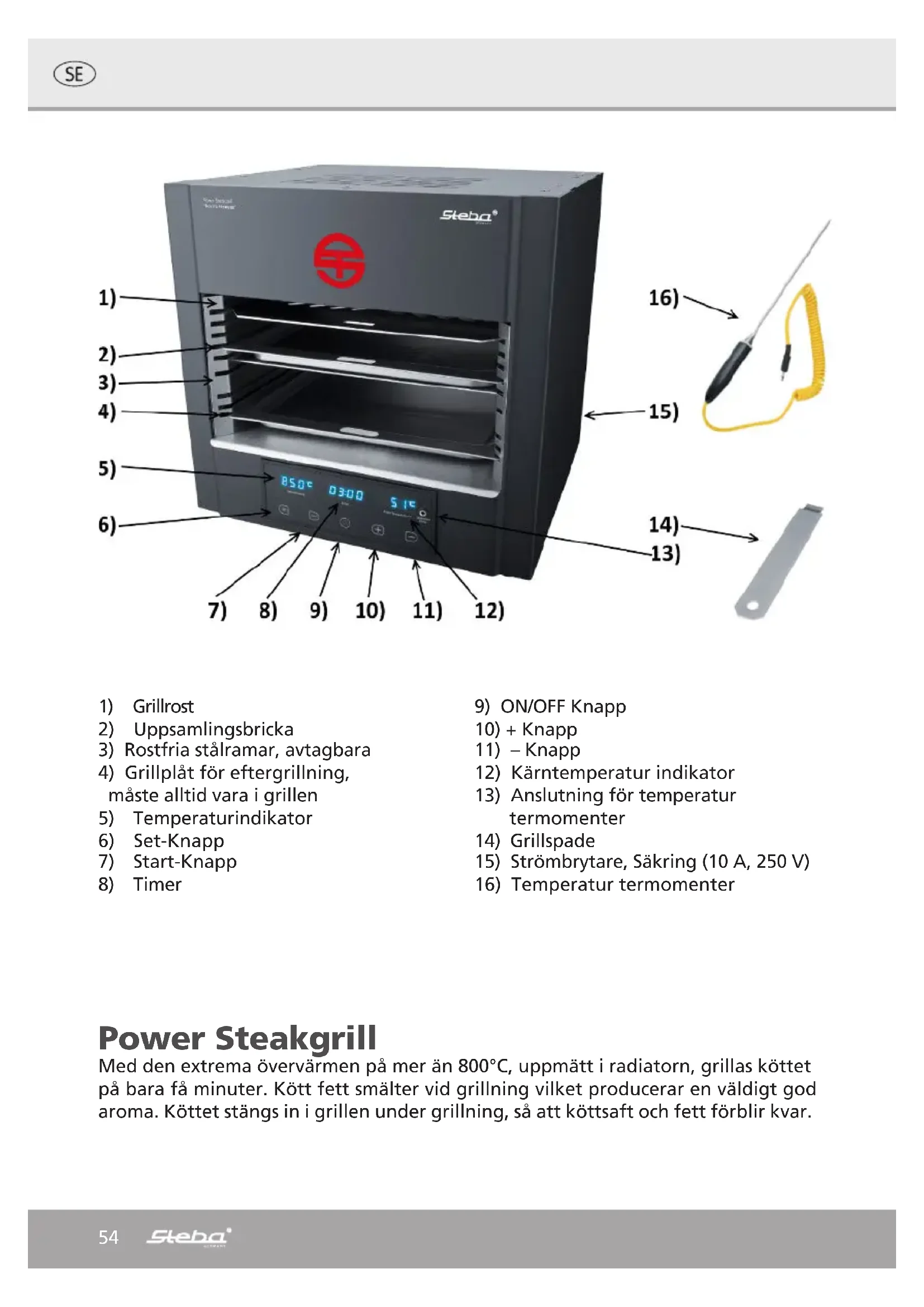 Power Steakgrill Med den extrema övervärmen på mer än 800°C, uppmätt i radiatorn, grillas köttet på bara få minuter. Kött fett smälter vid grillning vilket producerar en väldigt god aroma. Köttet stängs in i grillen under grillning, så att köttsaft och fett förblir kvar.55 Allmänt Denna apparat är avsedd för hushålls- och inomhusbruk. Läs noggrant igenom bruksanvisningen och bevara den på ett sä- kert ställe. Vid överlåtelse av apparaten till andra perspner måste bruksanvisningen följa med. Använd apparaten enligt instrukti- onerna och följ säkerhetsanvisningarna. För skador och olyckor som orsakats genome ej beaktande, övertas inget ansvar. Ta bort eventuellt förpackningsmaterial och alla klistermärken. Rengör alla delar noggrant (se rengöring). Säkerhetsanvisningar ∙ Het yta! Det finns risk för brännskador vid beröring av ytan under pågående drift. Placera grillen med ett avstånd på 10 cm på sidan och 70 cm uppåt. ∙ Anslut och använd grillen endast genom att följa anvisningarna som anges på typskyltarna. ∙ Grillen är inte lämpad för inbyggnad och får inte heller använ- das som en sådan. ∙ Använd endast om ledningen och grillen inte är skadade. Kon- trollera före varje användning! ∙ Berör inte kontakten med våta händer. ∙ Anslut grillen endast I jordasnlutna och lättåtkomliga eluttag. ∙ Dra aldrig ut kontakten genom att dra I kabeln, utan genom att dra i kontakten. ∙ Dra alltid ut kontakten efter varje användning eller vid fel. ∙ Dra aldrig elsladden. Se till att den inte skaver mot vass kant eller kläms. ∙ Håll elsladden borta från varma ytor.