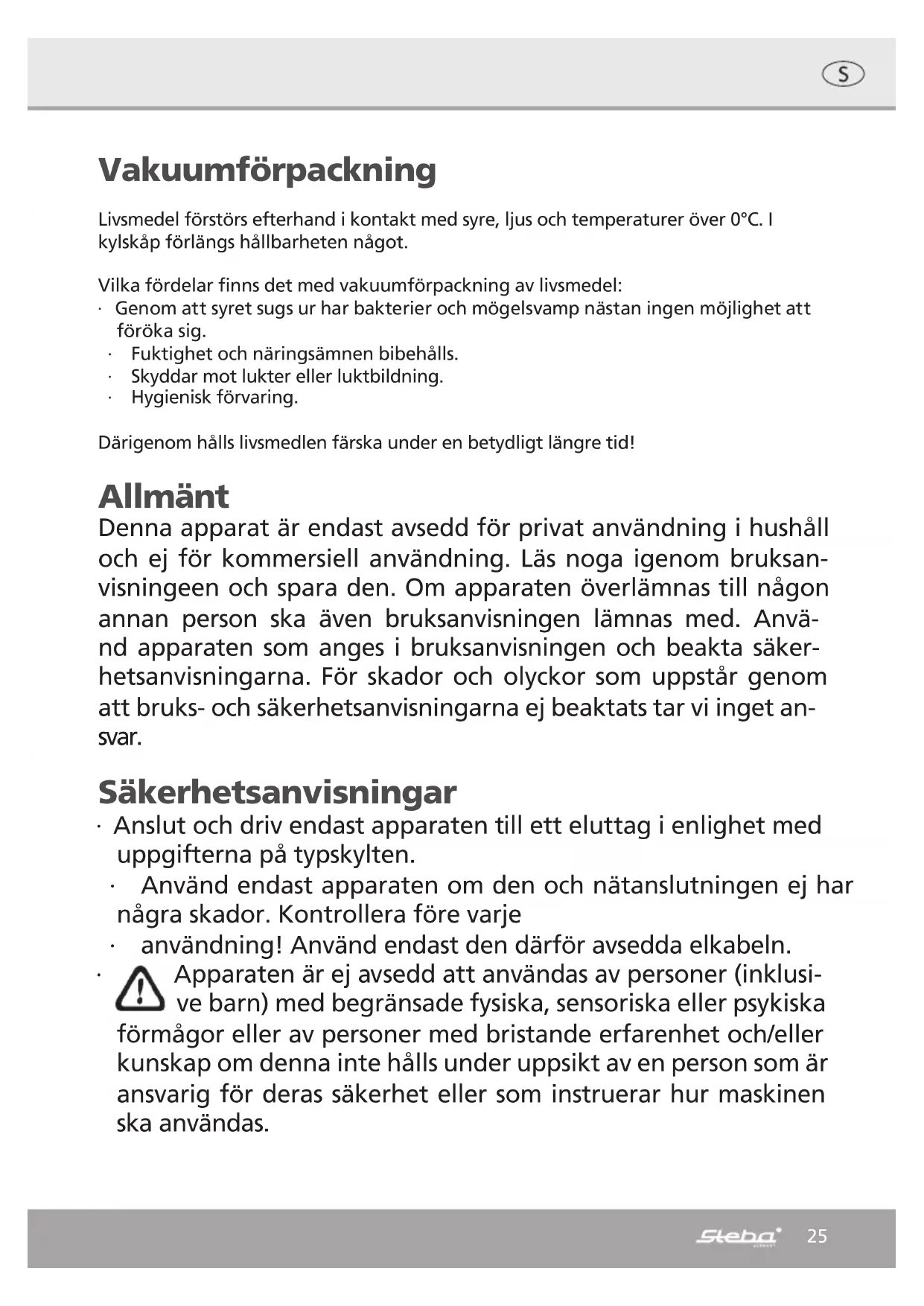 Vakuumsvejsning ∙ Fordærvede levnedsmidler og brændbare væsker må ikke svejses inde. ∙ Vær opmærksom på at vakuumpumpen ikke suger væske til sig. Når dette er tilfæl- det, så tryk omgående stoptasten . ∙ Levnedsmidlerne puttes i posen. Vær opmærksom på, at folien ikke beskadiges af genstande med skarpe kanter. ∙ Posen lægges foldefri og tør indtil midten af vakuumkammeret! ∙ Lad låget i venstre og højre side gå hørbart i hak og tryk tasten . ∙ Svejs ikke to gange på samme sted, da folien ellers kan brænde igennem! ∙ Hold en pause på 1 minut mellem svejsningerne, så apparatet kan afkøle. ∙ Skulle apparatet være overbelastet, så slukker overophedningssikringen for apparatet. Træk i dette tilfælde stikket og lad apparatet afkøle i ca. 20 minutter. Rengøring ∙ Træk først stikket. ∙ Dyb ikke apparatet i vand og hæld ikke vand over det. ∙ Tag væskeopfanget ud af apparatet og skyl. ∙ Apparatet tørres af med en fugtig klud med opvaskemiddel. Pas derved på at svejselisten og tætningen ikke beskadiges. ∙ Tør derefter apparatet. ∙ Husk aldrig at klikke låget helt i når maskinen ikke anvendes, da pakningerne der- ved trykkes flade!24 Korrekt skrotning af maskinen Når maskinen har udtjent, skal den omgående gøres ubrugelig. Inden for EU gør dette symbol opmærksomt på, at den pågældende genstand ikke må anbringes i dagrenovationen. Udtjente apparater indeholder værdifulde materialer, som skal recirkuleres, så miljøet og folks helbred ikke lider skade af ukontrolleret deponering. Aflever derfor maski- nen på genbrugspladsen eller send den til skrotning der, hvor den er købt. Butikken sørger derefter for at aflevere maskinen til korrekt recirkulering. Aflevering af emballagen Emballager må ikke anbringes i dagrenovationen, men skal afleveres på genbrugs- pladsen. ∙ Papir-, pap- og bølgepapemballager skal afleveres på en genbrugsplads. ∙ Plasticemballager og -film skal også anbringes i en indsamlingsbeholder. I eksemplerne for mærkning af plasticmaterialer står der: PE for polyætylen, koderne 02 for højtryks-polyætylen, 04 for lavtryks-polyætylen, PP for polypropylen og PS for polystyren. Service Hvis det mod forventning skulle blive nødvendigt at reparere maskinen, bedes der rettet henvendelse til nedenstående adresse. Hvis der er tale om en garantirepa- ration, sørger STEBA for afhentningen. Maskinen skal være emballeret, så den kan transporteres. STEBA modtager ikke pakker, som modtageren skal betale forsendelsen af. STEBA Elektrogeräte GmbH & Co KG, Pointstrasse 2, 96129 Strullendorf, Tyskland Tlf.: +49 95 43 - 4 49 17 og +49 95 44 - 4 49 18, Telefax: +49 95 43 - 4 49 19 E-mail: elektro@steba.com Hjemmeside: http://www.steba.com OBS! Elektriske apparater må kun repareres af uddannede elektrikere, fordi ukorrek- te reparationer kan medføre store følgeskader.25 Vakuumförpackning Livsmedel förstörs efterhand i kontakt med syre, ljus och temperaturer över 0°C. I kylskåp förlängs hållbarheten något. Vilka fördelar finns det med vakuumförpackning av livsmedel: ∙ Genom att syret sugs ur har bakterier och mögelsvamp nästan ingen möjlighet att föröka sig. ∙ Fuktighet och näringsämnen bibehålls. ∙ Skyddar mot lukter eller luktbildning. ∙ Hygienisk förvaring. Därigenom hålls livsmedlen färska under en betydligt längre tid! Allmänt Denna apparat är endast avsedd för privat användning i hushåll och ej för kommersiell användning. Läs noga igenom bruksan- visningeen och spara den. Om apparaten överlämnas till någon annan person ska även bruksanvisningen lämnas med. Anvä- nd apparaten som anges i bruksanvisningen och beakta säker- hetsanvisningarna. För skador och olyckor som uppstår genom att bruks- och säkerhetsanvisningarna ej beaktats tar vi inget an- svar. Säkerhetsanvisningar ∙ Anslut och driv endast apparaten till ett eluttag i enlighet med uppgifterna på typskylten. ∙ Använd endast apparaten om den och nätanslutningen ej har några skador. Kontrollera före varje ∙ användning! Använd endast den därför avsedda elkabeln. ∙ Apparaten är ej avsedd att användas av personer (inklusi- ve barn) med begränsade fysiska, sensoriska eller psykiska förmågor eller av personer med bristande erfarenhet och/eller kunskap om denna inte hålls under uppsikt av en person som är ansvarig för deras säkerhet eller som instruerar hur maskinen ska användas.26 ∙ Barn bör hållas under uppsikt för att garantera att de ej leker med apparaten eller förpackningen. ∙ Apparaten får ej anslutas till ej timer eller drivas med ett sepa- rat fjärrkontrollsystem! ∙ Dra ur stickkontakten efter varje användning eller vid fel. ∙ Dra ej i elkabeln. Se till att den inte skaver mot kanter eller kläms. ∙ Håll elkabeln borta från varma delar. ∙ Förvara ej apparaten utomhus eller i fuktiga rum. ∙ Doppa ej apparaten i vatten. ∙ Använd aldrig apparaten efter att ett fel har uppstått, t.ex. om den fallit ner eller ∙ har skadats på annat sätt. ∙ Tillverkaren tar inget ansvar vid felaktig användning som kan hänvisas ∙ till att bruksanvisningen ej beaktats. ∙ För att undvika faror får reparationer av apparaten, t.ex. byte av elkabel, endast utföras av kundtjänst. ∙ Transportera endast apparaten när den har svalnat. När appa- raten är i drift blir delar som kan vidröras varma. ∙ Dra ur stickkontakten när apparaten ej används. ∙ Om en förlängningskabel används bör barn hållas under upp- sikt så att de ej drar i eller snubblar över kabeln.