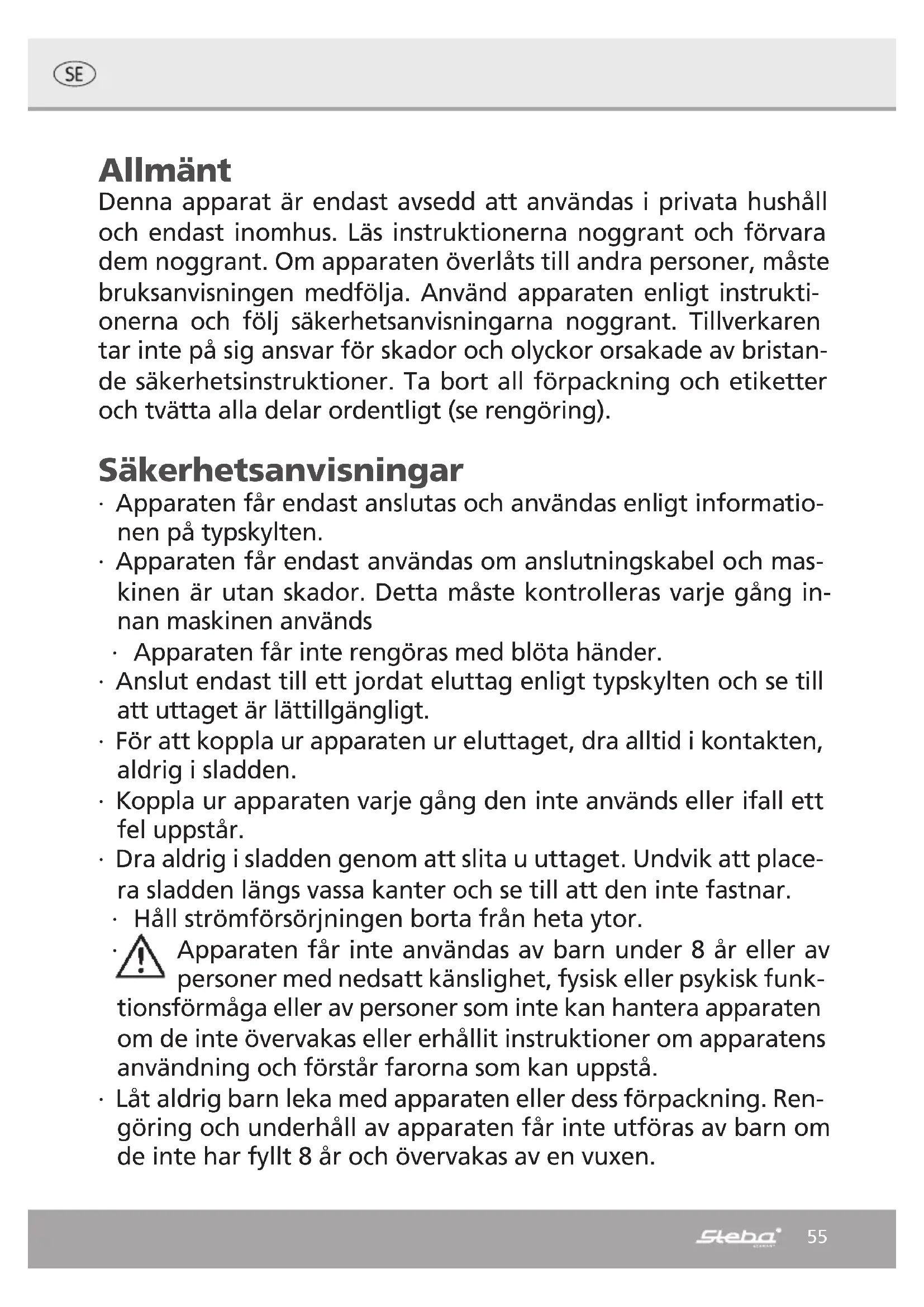 Apparaten får inte användas av barn under 8 år eller av personer med nedsatt känslighet, fysisk eller psykisk funk- tionsförmåga eller av personer som inte kan hantera apparaten om de inte övervakas eller erhållit instruktioner om apparatens användning och förstår farorna som kan uppstå. ∙ Låt aldrig barn leka med apparaten eller dess förpackning. Ren- göring och underhåll av apparaten får inte utföras av barn om de inte har fyllt 8 år och övervakas av en vuxen.56 ∙ Apparaten och dess sladd måste hållas utom räckhåll för barn under 8 år. ∙ Barn ska övervakas av en vuxen för att se till att de inte leker med apparaten eller dess förpackning (till exempel med plast- påsar). ∙ Använd inte apparaten med en timer eller separat fjärrkontroll- system! ∙ Apparaten får inte användas utan övervakning. ∙ Förvara inte apparaten i öppet eller fuktigt rum. ∙ Doppa inte apparaten i vatten! ∙ Använd aldrig apparaten efter fel, som till exempel om den har fallit eller skadats på något sätt. ∙ Tillverkaren tar inte på sig ansvar för skador och olyckor orsaka- de av bristande säkerhetsinstruktioner. ∙ För att undvika farliga situationer, måste reparationer av ap- paraten utföras endast av kvalificerad serviceverkstad. Endast originaldelar får användas. ∙ Apparaten bliver varm och får endast transporteras efter kyl- ning. ∙ Apparaten får endast användas enligt de syften som beskrivs i bruksanvisningen. ∙ Denna apparat är avsedd för användning i hushåll och av: o Personal inom köksområden, i butiker, kontor och andra arbetsmiljöer o Av kunder i hotell, motell och andra bostadsmöjligheter o Bed and breakfast miljöer. ∙ Innan första användningen: Alla delar ska rengöras och tor- kas noggrant. ∙ Ifall du använder en förlängningskabel måste den ha ett tvärs- nitt på 1,5 mm². Förlängningssladden måste alltid rullas ut helt. ∙ När du använder en GS-godkänd 16 A multiförlängningssladd, får den inte laddas med mer än 3680 watt. Det finns risk för brand! ∙ Var uppmärksam på att barn inte drar i sladden och den inte utgör fara för snubbling.57 ∙ Apparaten måste alltid kopplas ur eluttaget innan montering, demontering eller rengöring. ∙ Hygien: På grund av bakterier och mögel som kan uppstå, är det viktigt att apparaten alltid rengörs! ∙ Säkerhetslås: apparaten stängs automatiskt av ifall locket öppnas under användning. Rengöring Observera! Innan varje rengöring, ska eluttaget kopplas ur och apparaten ska svalna! Apparaten får inte doppas i vatten. Matrester ska slängas av hygieniska skäl. Varmt vatten och lite diskmedel ska fyllas i kannan och mixas under kort tid. Skölj behållaren noggrant efteråt. Locket och lockinsatsen ska rengöras och torkas efteråt. Varning! Knivarna är vassa! Rengör motorblocket med en fuktig trasa. Använd inte starka rengöringsmedel eller stålull. Arbetsplatsen Viktigt Placera aldrig apparaten på eller intill en varm yta (till exempel spis), utan bara på en jämn, stabil, icke-metallisk och värmebe- ständig bordskiva. Det är alltid viktigt att se till att det inte finns brännbara föremål i närheten. Placera inte apparaten på bordets kant så att barn kan nå upp till den eller så att den faller ner vid beröring.58