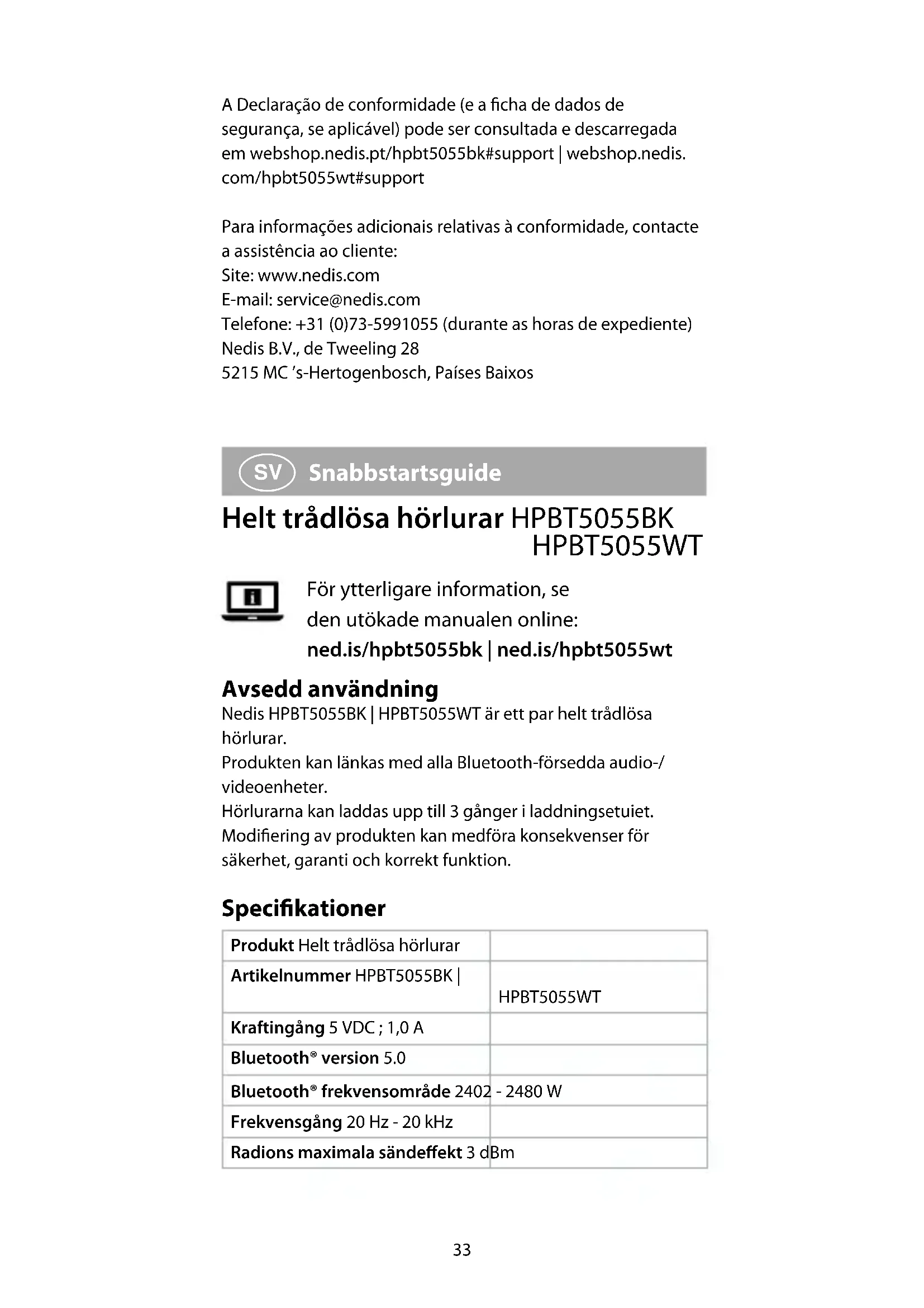 tillverkad i Kina, har testats i enlighet med alla relevanta CE- standarder och föreskrifter och att alla tester genomförts med godkänt resultat. Detta inkluderar, men är inte begränsat till, radioutrustningsdirektivet 2014/53/EU. Den fullständiga försäkran om överensstämmelse (och säkerhetsdatabladet, om tillämpligt) kan läsas och laddas ned från webshop.nedis.sv/hpbt5055bk#support | webshop.nedis. com/hpbt5055wt#support37 För ytterligare information om överensstämmelse, var god kontakta vår kundtjänst: Webbplats: www.nedis.com E-post: service@nedis.com Telefon: +31 (0)73-5991055 (under kontorstid) Nedis B.V., de Tweeling 28 5215 MC ’s-Hertogenbosch, Nederländerna