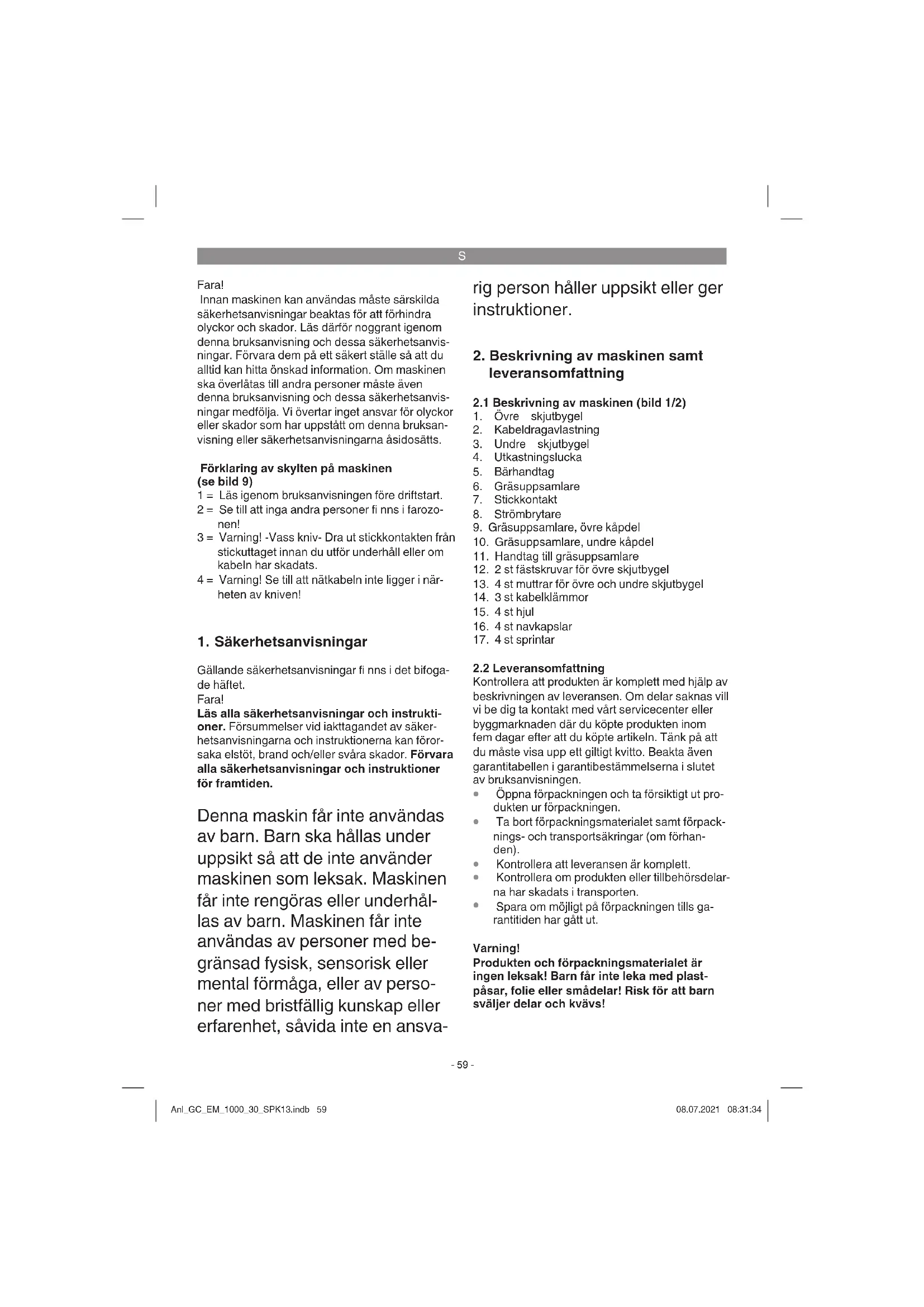 Spara om möjligt på förpackningen tills ga- rantitiden har gått ut. Varning! Produkten och förpackningsmaterialet är ingen leksak! Barn får inte leka med plast- påsar, folie eller smådelar! Risk för att barn sväljer delar och kvävs! Anl_GC_EM_1000_30_SPK13.indb 59Anl_GC_EM_1000_30_SPK13.indb 59 08.07.2021 08:31:3408.07.2021 08:31:34S