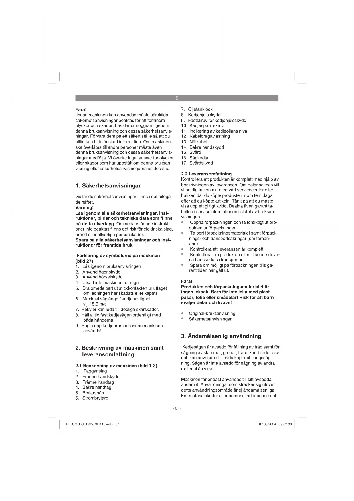 Kedjesågen är avsedd för fällning av träd samt för sågning av stammar, grenar, träbalkar, brädor osv. och kan användas till båda kap- och längssåg- ning. Sågen är inte avsedd för sågning av andra material än virke. Maskinen får endast användas till sitt avsedda ändamål. Användningar som sträcker sig utöver detta användningsområde är ej ändamålsenliga. För materialskador eller personskador som resul- Anl_GC_EC_1935_SPK13.indb 67Anl_GC_EC_1935_SPK13.indb 67 07.05.2024 09:02:3607.05.2024 09:02:36S