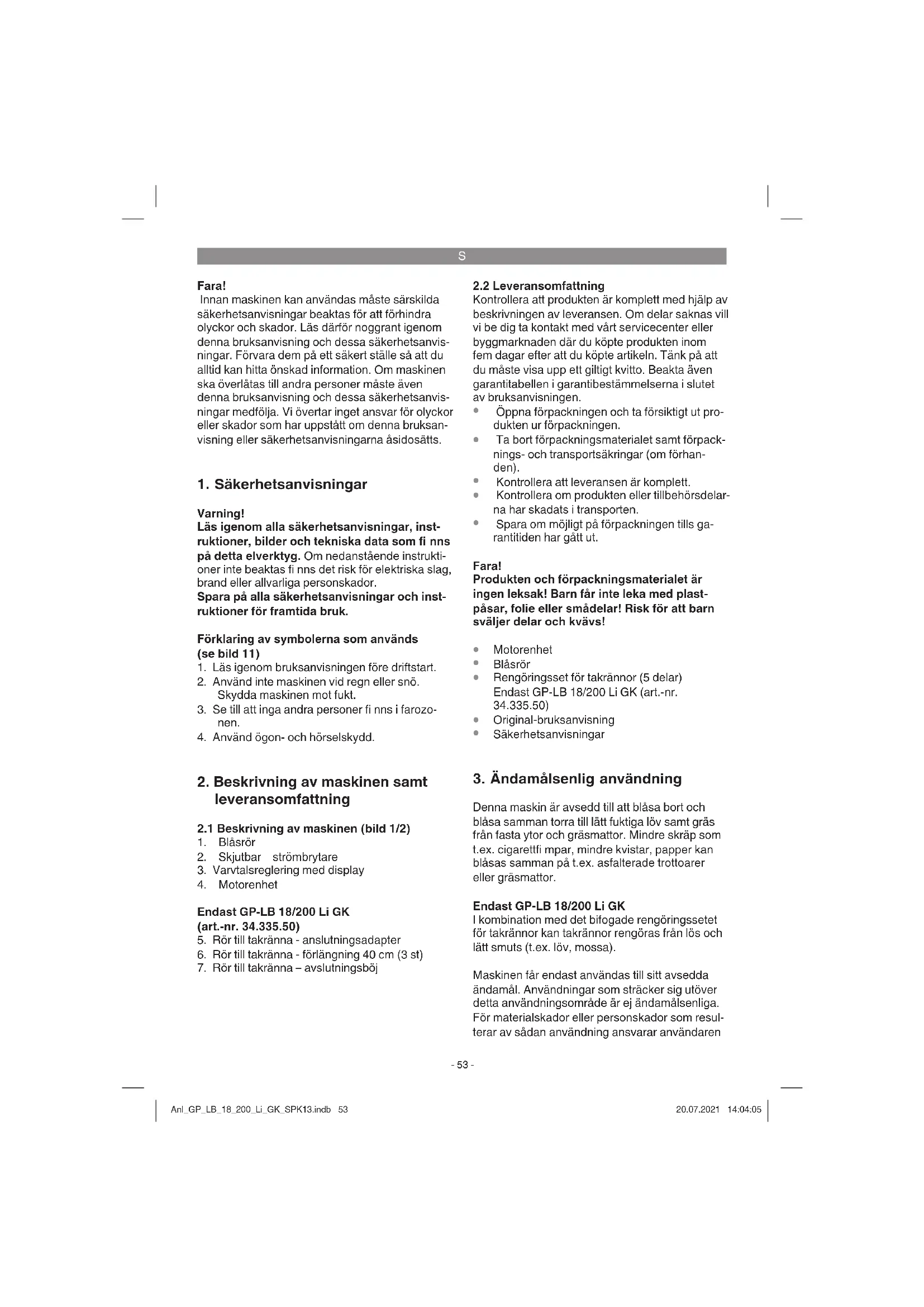 Denna maskin är avsedd till att blåsa bort och blåsa samman torra till lätt fuktiga löv samt gräs från fasta ytor och gräsmattor. Mindre skräp som t.ex. cigarettfi mpar, mindre kvistar, papper kan blåsas samman på t.ex. asfalterade trottoarer eller gräsmattor. Endast GP-LB 18/200 Li GK I kombination med det bifogade rengöringssetet för takrännor kan takrännor rengöras från lös och lätt smuts (t.ex. löv, mossa). Maskinen får endast användas till sitt avsedda ändamål. Användningar som sträcker sig utöver detta användningsområde är ej ändamålsenliga. För materialskador eller personskador som resul- terar av sådan användning ansvarar användaren Anl_GP_LB_18_200_Li_GK_SPK13.indb 53Anl_GP_LB_18_200_Li_GK_SPK13.indb 53 20.07.2021 14:04:0520.07.2021 14:04:05S