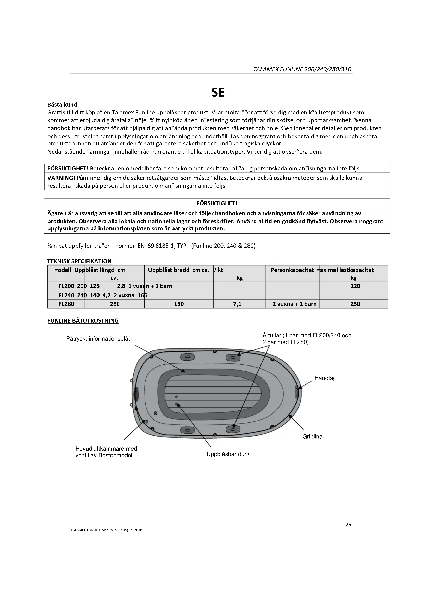 Bästa kund, Grattis till ditt köp av en Talamex Funline uppblåsbar produkt. Vi är stolta över att förse dig med en kvalitetsprodukt som kommer att erbjuda dig åratal av nöje. Ditt nyinköp är en investering som förtjänar din skötsel och uppmärksamhet. Denna handbok har utarbetats för att hjälpa dig att använda produkten med säkerhet och nöje. Den innehåller detaljer om produkten och dess utrustning samt upplysningar om användning och underhåll. Läs den noggrant och bekanta dig med den uppblåsbara produkten innan du använder den för att garantera säkerhet och undvika tragiska olyckor. Nedanstående varningar innehåller råd härrörande till olika situationstyper. Vi ber dig att observera dem. FÖRSIKTIGHET! Betecknar en omedelbar fara som kommer resultera i allvarlig personskada om anvisningarna inte följs. VARNING! Påminner dig om de säkerhetsåtgärder som måste vidtas. Betecknar också osäkra metoder som skulle kunna resultera i skada på person eller produkt om anvisningarna inte följs. FÖRSIKTIGHET! Ägaren är ansvarig att se till att alla användare läser och följer handboken och anvisningarna för säker användning av produkten. Observera alla lokala och nationella lagar och föreskrifter. Använd alltid en godkänd flytväst. Observera noggrant upplysningarna på informationsplåten som är påtryckt produkten. Din båt uppfyller kraven i normen EN ISO 6185-1, TYP I (Funline 200, 240 & 280) TEKNISK SPECIFIKATION Modell Uppblåst längd cm ca.