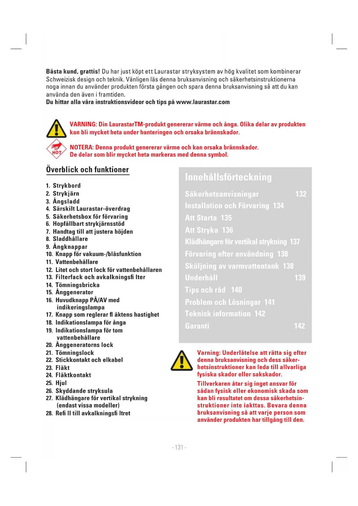 nale garanti trådte i kraft i juni 2017. DK- 131 - Varning: Underlåtelse att rätta sig efter denna bruksanvisning och dess säker- hetsinstruktioner kan leda till allvarliga fysiska skador eller sakskador. Tillverkaren åtar sig inget ansvar för sådan fysisk eller ekonomisk skada som kan bli resultatet om dessa säkerhetsin- struktioner inte iakttas. Bevara denna bruksanvisning så att varje person som använder produkten har tillgång till den. VARNING: Din LaurastarTM-produkt genererar värme och ånga. Olika delar av produkten kan bli mycket heta under hanteringen och orsaka brännskador. NOTERA: Denna produkt genererar värme och kan orsaka brännskador. De delar som blir mycket heta markeras med denna symbol. Innehållsförteckning Säkerhetsanvisningar 132 Installation och Förvaring 134 Att Starta 135 Att Stryka 136 Klädhängare för vertikal strykning 137 Förvaring efter användning 138 Sköljning av varmvattentank 138 Underhåll 139 Tips och råd 140 Problem och Lösningar 141 Teknisk information 142 Garanti 142 Bästa kund, grattis! Du har just köpt ett Laurastar stryksystem av hög kvalitet som kombinerar Schweizisk design och teknik. Vänligen läs denna bruksanvisning och säkerhetsinstruktionerna noga innan du använder produkten första gången och spara denna bruksanvisning så att du kan använda den även i framtiden. Du hittar alla våra instruktionsvideor och tips på www.laurastar.com Överblick och funktioner
