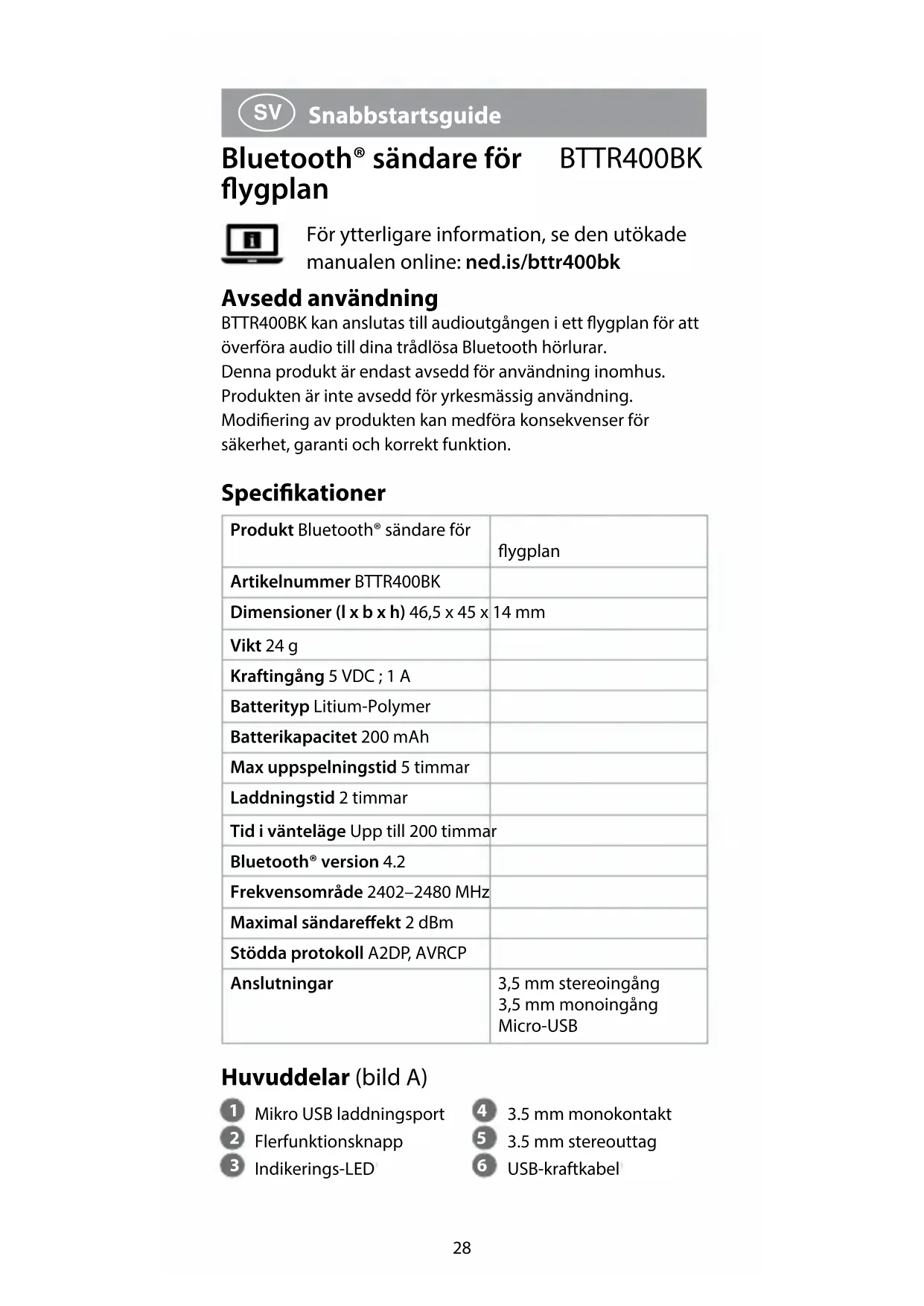 Snabbstartsguide Bluetooth® sändare för ygplan BTTR400BK För ytterligare information, se den utökade manualen online: ned.is/bttr400bk Avsedd användning BTTR400BK kan anslutas till audioutgången i ett ygplan för att överföra audio till dina trådlösa Bluetooth hörlurar. Denna produkt är endast avsedd för användning inomhus. Produkten är inte avsedd för yrkesmässig användning. Modiering av produkten kan medföra konsekvenser för säkerhet, garanti och korrekt funktion. Specikationer Produkt Bluetooth® sändare för ygplan Artikelnummer BTTR400BK Dimensioner (l x b x h) 46,5 x 45 x 14 mm Vikt 24 g Kraftingång 5 VDC ; 1 A Batterityp Litium-Polymer Batterikapacitet 200 mAh Max uppspelningstid 5 timmar Laddningstid 2 timmar Tid i vänteläge Upp till 200 timmar Bluetooth® version 4.2 Frekvensområde 2402–2480 MHz Maximal sändareekt 2 dBm Stödda protokoll A2DP, AVRCP Anslutningar 3,5 mm stereoingång 3,5 mm monoingång Micro-USB Huvuddelar (bild A)