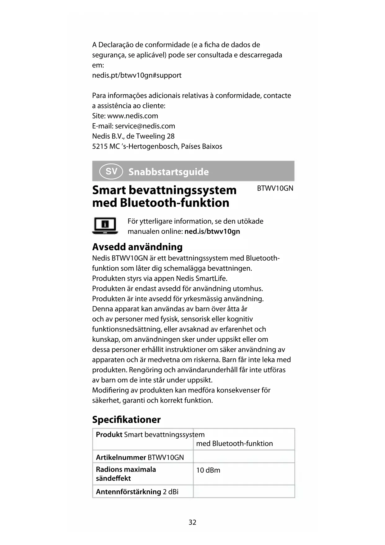 Använd appen för att ställa in och använda produkten. Mer information om appens funktioner och möjligheter nns i den utökade online-manualen. Försäkran om överensstämmelse Vi, Nedis B.V., försäkrar som tillverkare att produkten BTWV10GN från vårt varumärke Nedis®, tillverkad i Kina, har testats i enlighet med alla relevanta CE-standarder och föreskrifter och att alla tester genomförts med godkänt resultat. Detta inkluderar, men är inte begränsat till, radioutrustningsdirektivet 2014/53/EU. Den fullständiga försäkran om överensstämmelse (och säkerhetsdatabladet, om tillämpligt) kan läsas och laddas ned från: nedis.sv/btwv10gn#support För ytterligare information om överensstämmelse, var god kontakta vår kundtjänst: Webbplats: www.nedis.com E-post: service@nedis.com Nedis B.V., de Tweeling 28 5215 MC ’s-Hertogenbosch, Nederländerna36