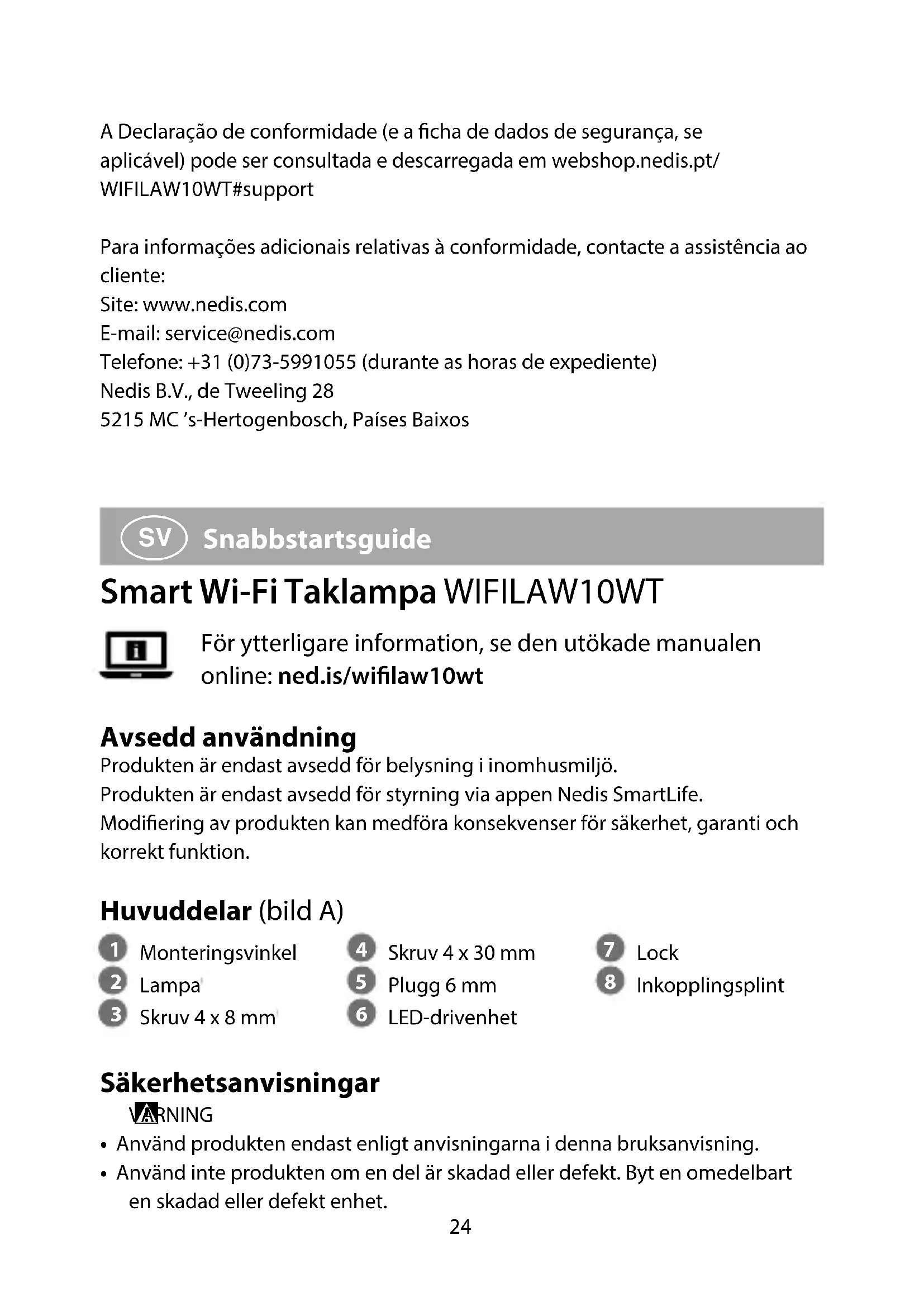 Snabbstartsguide Smart Wi-Fi Taklampa WIFILAW10WT För ytterligare information, se den utökade manualen online: ned.is/wilaw10wt Avsedd användning Produkten är endast avsedd för belysning i inomhusmiljö.Produkten är endast avsedd för styrning via appen Nedis SmartLife.Modiering av produkten kan medföra konsekvenser för säkerhet, garanti och korrekt funktion. Huvuddelar (bild A)