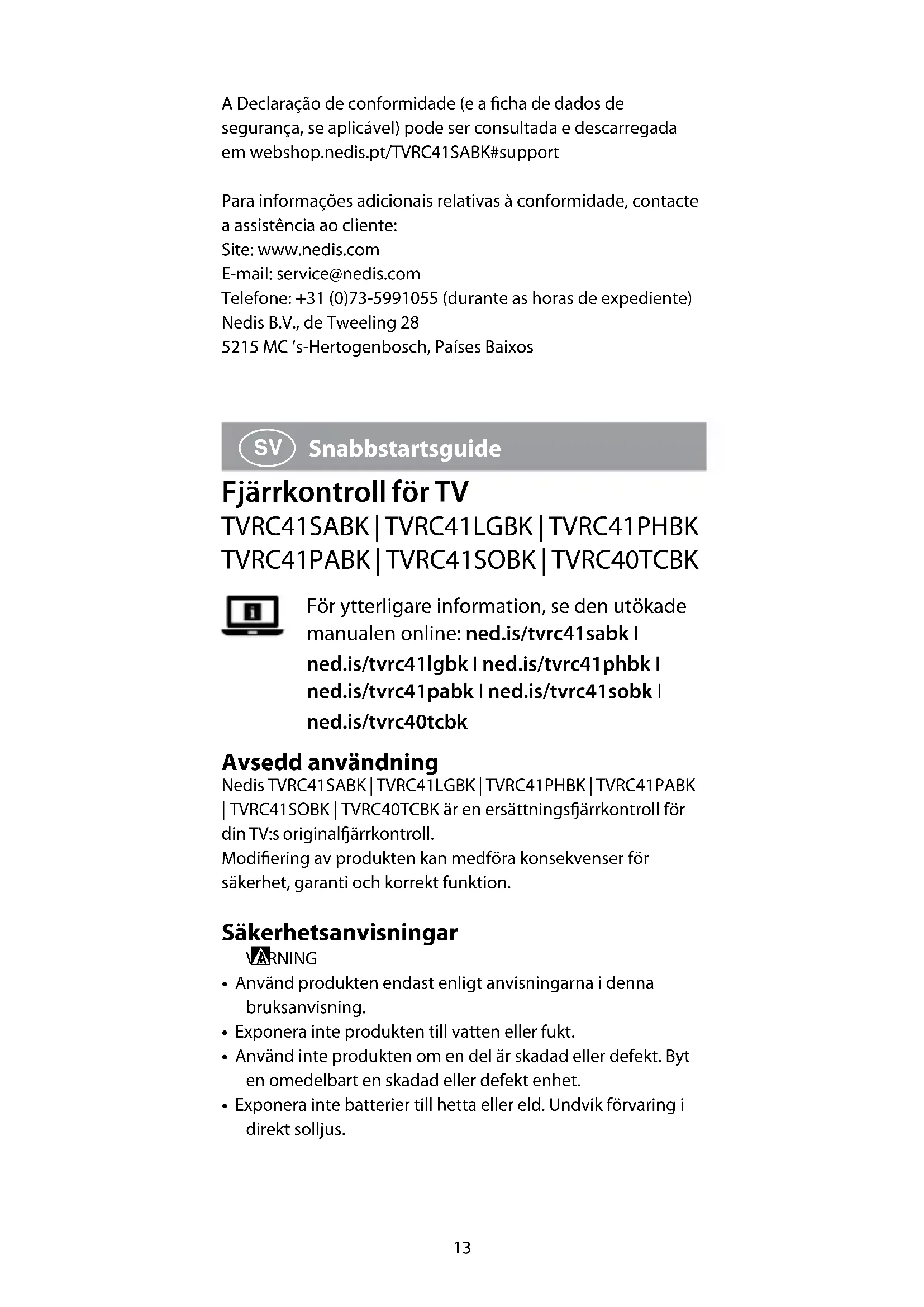 VARNING• Använd produkten endast enligt anvisningarna i denna bruksanvisning.• Exponera inte produkten till vatten eller fukt.• Använd inte produkten om en del är skadad eller defekt. Byt en omedelbart en skadad eller defekt enhet.• Exponera inte batterier till hetta eller eld. Undvik förvaring i direkt solljus.14 Installera produkten Denna ärrkontroll täcker så många funktioner som möjligt, men vissa knappar på denna ärrkontroll kanske inte är kongurerade för din TV. Dessa kan kongureras manuellt.För ytterligare information, se den utökade manualen online. Försäkran om överensstämmelse Vi, Nedis B.V., försäkrar som tillverkare att produkten TVRC41SABK från vårt varumärke Nedis , tillverkad i Kina, har testats i enlighet med alla relevanta CE-standarder och föreskrifter och att alla tester genomförts med godkänt resultat. Detta inkluderar, men är inte begränsat till, radioutrustningsdirektivet 2014/53/EU.Den fullständiga försäkran om överensstämmelse (och säkerhetsdatabladet, om tillämpligt) kan läsas och laddas ned från webshop.nedis.sv/TVRC41SABK#supportFör ytterligare information om överensstämmelse, var god kontakta vår kundtjänst:Webbplats: www.nedis.comE-post: service@nedis.comTelefon: +31 (0)73-5991055 (under kontorstid)Nedis B.V., de Tweeling 285215 MC ’s-Hertogenbosch, Nederländerna