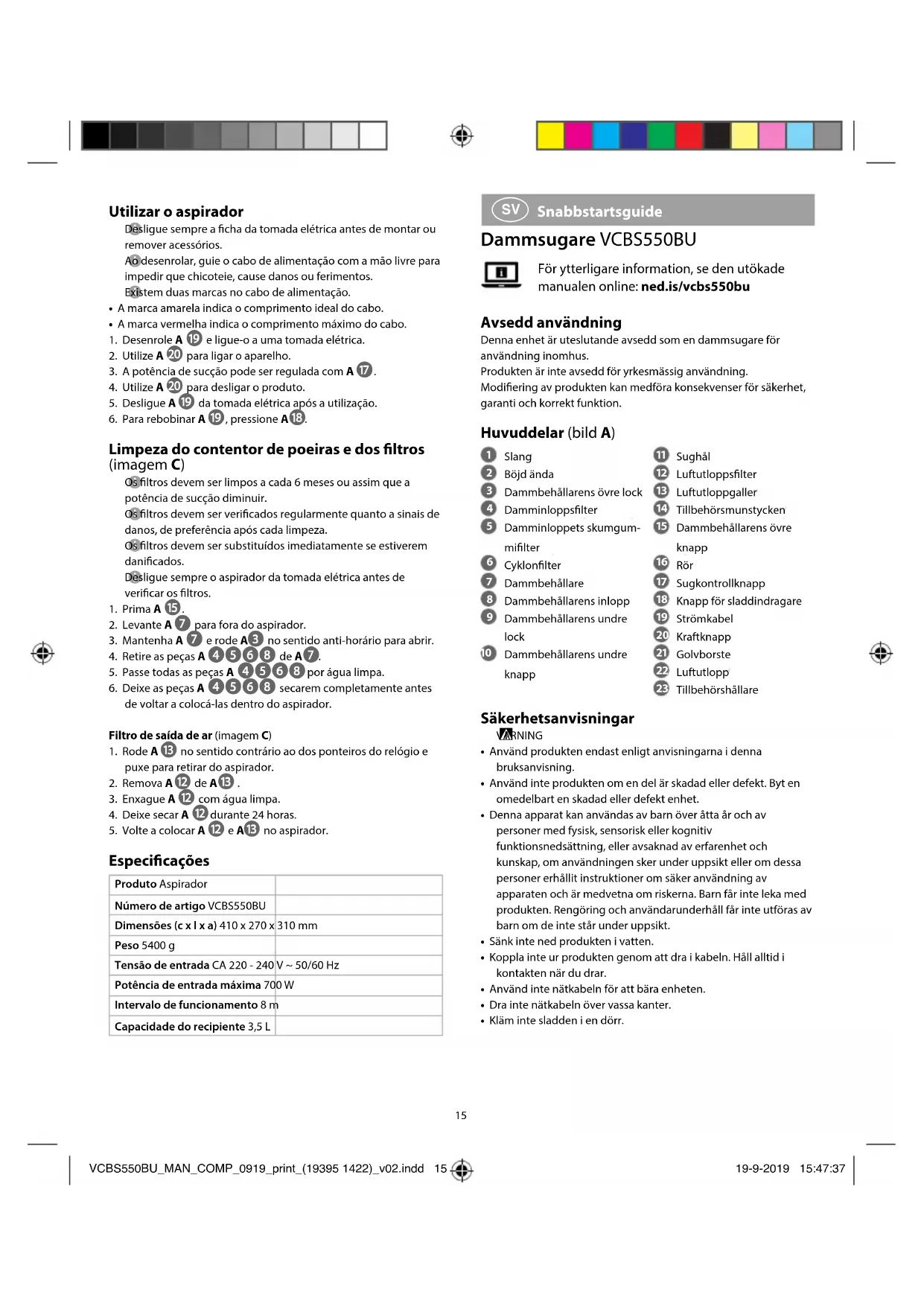 Snabbstartsguide Dammsugare VCBS550BU För ytterligare information, se den utökade manualen online: ned.is/vcbs550bu Avsedd användning Denna enhet är uteslutande avsedd som en dammsugare för användning inomhus.Produkten är inte avsedd för yrkesmässig användning.Modiering av produkten kan medföra konsekvenser för säkerhet, garanti och korrekt funktion. Huvuddelar (bild A)