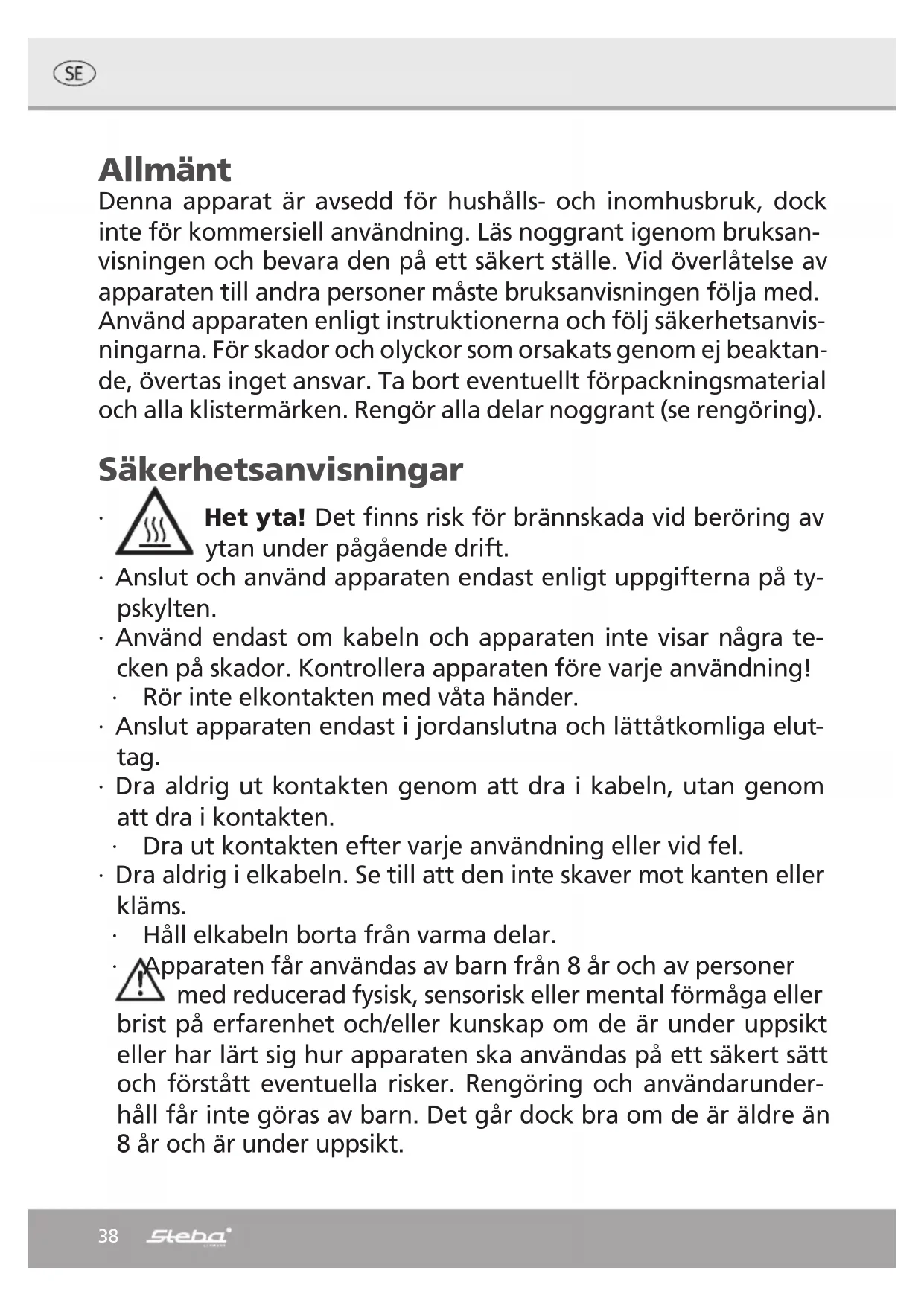 - revetemmentaler-ost, hvorefter de foldes sammen som beskrevet nedenfor. Vær opmærksom på, at jo mørkere crepesene er, desto vanskeligere er det at rulle eller folde dem sammen. Sammenfoldning af crepesene Klap de to sider Fold crepen sammen Crepen ind mod midten på midten er færdig37 Korrekt bortskaffelse af dette produkt: Nedslidte maskiner skal straks tages ud af brug. Inden for den Europæiske Union, indikerer dette symbol, at produktet ikke må bortskaffes sammen med andet husholdningsaffald. Elektronisk affald indeholder værdifulde og genanvendelige materialer, som burde blive gen- brugt for ikke at skade naturen eller menneskers sundhed igennem ukontrol- leret affaldshåndtering. Sørg derfor altid for at aflevere elektronisk affald på en genbrugsstation eller sende det til bortskaffelse hos forhandleren. Denne sørger he- refter for at maskinenens komponenter genbruges. Bortskaffelse af emballage: Smid aldrig blot emballagen ud, men bortskaf det på korrekt og ansvarlig vis til genanvendelse. Emballage: ∙ Aflever papir-, pap- og bølgepapemballage på genbrugsstationen. ∙ Forpakningsdele af plastik og folie skal ligeledes afleveres i den dertil indrettede opsamlingsbeholder I eksemplerne på mærkning af plastmaterialer står: PE for polyethy- len, kodenummer 02 for PE-HD, 04 for PE-LD, PP for polypropylen, PS for polystyrol. Kundeservice: Hvis din maskine mod forventning får brug for service, bedes du kontakte os på følgende adresse. Vi afhenter apparatet hvis den stadig er dækket af garantien. Ap- paratet skal pakkes ind til transport. Ufrankerede pakker modtages ikke! STEBA Elektriske Apparater ApS & Co K/S Pointstr. 2, 96129 Strullendorf / Germany Salgstelefon: 09543 / 449-17 / -18, servicetelefon: 09543 / 449-44, fax: 09543 / 449-19 e-Mail: elektro@steba.com Internet: http://www.steba.com Advarsel! For at undgå væsentlige skader, der kan opstå som følge af ukyndig repa- ration, må elektroniske apparater kun repareres af autoriserede el-reparatører.38 Allmänt Denna apparat är avsedd för hushålls- och inomhusbruk, dock inte för kommersiell användning. Läs noggrant igenom bruksan- visningen och bevara den på ett säkert ställe. Vid överlåtelse av apparaten till andra personer måste bruksanvisningen följa med. Använd apparaten enligt instruktionerna och följ säkerhetsanvis- ningarna. För skador och olyckor som orsakats genom ej beaktan- de, övertas inget ansvar. Ta bort eventuellt förpackningsmaterial och alla klistermärken. Rengör alla delar noggrant (se rengöring). Säkerhetsanvisningar ∙ Het yta! Det finns risk för brännskada vid beröring av ytan under pågående drift. ∙ Anslut och använd apparaten endast enligt uppgifterna på ty- pskylten. ∙ Använd endast om kabeln och apparaten inte visar några te- cken på skador. Kontrollera apparaten före varje användning! ∙ Rör inte elkontakten med våta händer. ∙ Anslut apparaten endast i jordanslutna och lättåtkomliga elut- tag. ∙ Dra aldrig ut kontakten genom att dra i kabeln, utan genom att dra i kontakten. ∙ Dra ut kontakten efter varje användning eller vid fel. ∙ Dra aldrig i elkabeln. Se till att den inte skaver mot kanten eller kläms. ∙ Håll elkabeln borta från varma delar. ∙ Apparaten får användas av barn från 8 år och av personer med reducerad fysisk, sensorisk eller mental förmåga eller brist på erfarenhet och/eller kunskap om de är under uppsikt eller har lärt sig hur apparaten ska användas på ett säkert sätt och förstått eventuella risker. Rengöring och användarunder- håll får inte göras av barn. Det går dock bra om de är äldre än 8 år och är under uppsikt.39 ∙ Barn yngre än 8 år ska hållas borta från apparaten och elkabeln. ∙ Barn bör övervakas för att säkerställa att de inte leker med ap- paraten eller med förpackningsmaterialet (som t.ex. plastpå- sar). ∙ Apparaten får inte drivas med en timer eller med en separat fjärrströmbrytare! ∙ Apparaten får inte användas utan tillsyn. ∙ Förvara ej apparaten utomhus eller i fuktiga rum. ∙ Doppa ej apparaten i vatten. ∙ Lämna minst 10 cm plats runt apparaten. ∙ Använd aldrig apparaten efter funktionsfel, t.ex. om den har tappats eller skadats på något annat sätt. ∙ Tillverkaren påtar sig inget ansvar för falsk eller felaktig anvä- ndning, vilket orsakats av att bruksanvisningen inte följts. ∙ För att undvika risker, får reparationer på apparaten, som t.ex. en skadad ledning, endast utföras av en auktoriserad kundt- jänst. Endast original reservedelar får användas. ∙ Apparaten blir väldigt varm och bör transportas endast efter kylning. ∙ Använd apparaten endast för de ändamål som beskrivs i bruksanvisningen. ∙ Apparaten är avsedd att användas i hushålls- och linknande mil- jöer så som: o I kök för anställda i affärer, kontor och andra företags- områden. o I jordbruksföretag och av anställda och kunder på hotell, motell eller andra övernattningsanläggningar. o På pensionat ∙ Innan första användningen: Rengör och torka alla delar. För att avlägsna eventuell lukt ska apparaten värmas upp i ca 15 minuter innan användning.40 ∙ Varning! Apparaten blir het. Risk för brännska- dor! Under drift kan temperaturen på ytorna bli väl- digt hög! Placera inte apparaten på känsliga underlag och håll den minst 70 cm från brännbart material (t.ex. gardi- ner). ∙ Vid användning av förlängningskabel måste den ha ett tvärs- nitt på 1,5 mm². ∙ Vid ett GS-testat vägguttag med flera grenar får man pga brandfara inte överskrida 3680 Watt. ∙ Se till att barnen inte drar i kabeln eller att det uppstår risk snubbling. ∙ Dra alltid ut kabeln ur eluttaget när du inte har apparaten un- der tillsyn, före montering, demontering eller rengöring. ∙ Hygien: På grund av bakterier och eventuellt mögel, är det viktigt att apparaten alltid rengörs! Rengöring ∙ Observera! Dra ut elkont