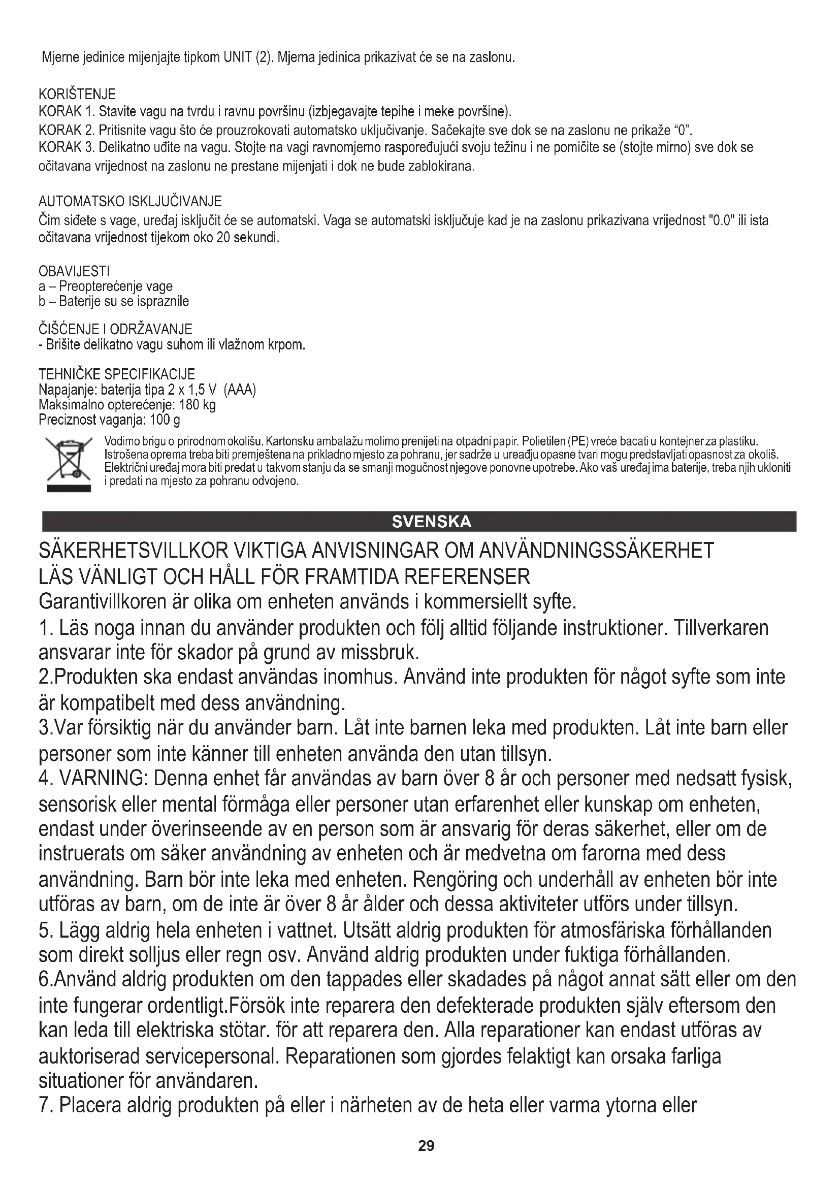 Torka vågen med en torr eller lite fuktig trasa. Strömning: batterityp 2 x 1,5 V (AAA) a - För mycket vikt på vågen Kapacitet: 180 kg Mätnoggrannhet: 100 g