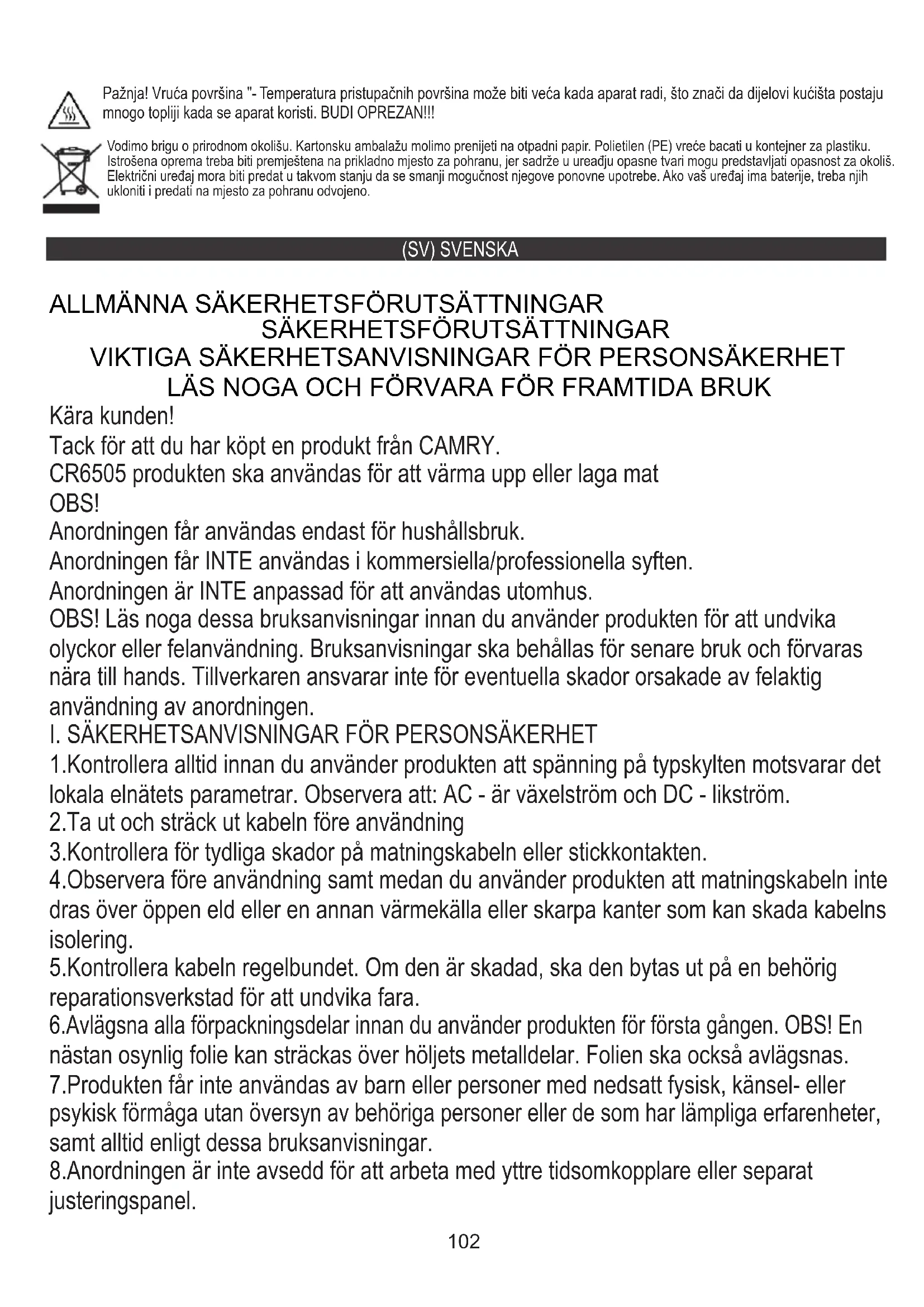OBS! 8.Anordningen är inte avsedd för att arbeta med yttre tidsomkopplare eller separat justeringspanel. 7.Produkten får inte användas av barn eller personer med nedsatt fysisk, känsel- eller psykisk förmåga utan översyn av behöriga personer eller de som har lämpliga erfarenheter, samt alltid enligt dessa bruksanvisningar. (SV) SVENSKA103