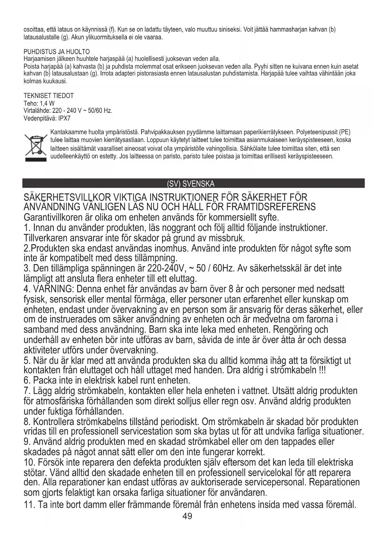Skölj borsthuvudet (a) noggrant under rinnande vatten efter borstning. Ta bort borsthuvudet (a) från handtaget (b) och rengör båda delarna separat under rinnande vatten. Torka sedan av dem torra innan du sätter på handtaget (b) på laddningsbasen (g). Koppla ur adaptern ur uttaget innan du rengör laddningsbasen. Borsthuvudet ska bytas minst var tredje månad. TEKNISK DATA Effekt: 1,4W Strömförsörjning: 220-240V ~ 50 / 60Hz. Vattentät: IPX7 Vi sköter om miljön. Överlämna förpackningar i kartong till pappersavfall. Polyetylensäckar (PE) slängs i avfallsbehållare för plast. Man bör lämna en gammal apparat till en riktig återvinningscentral, eftersom farliga komponenter i apparaten kan orsaka fara till miljön. En elektrisk apparat bör lämnas för att minska förnyad användning av denna. Om apparaten innehåller batterier, bör man ta bort dem och lämna dem separat till återvinningscentraler. (SK) SLOVENSKÝ