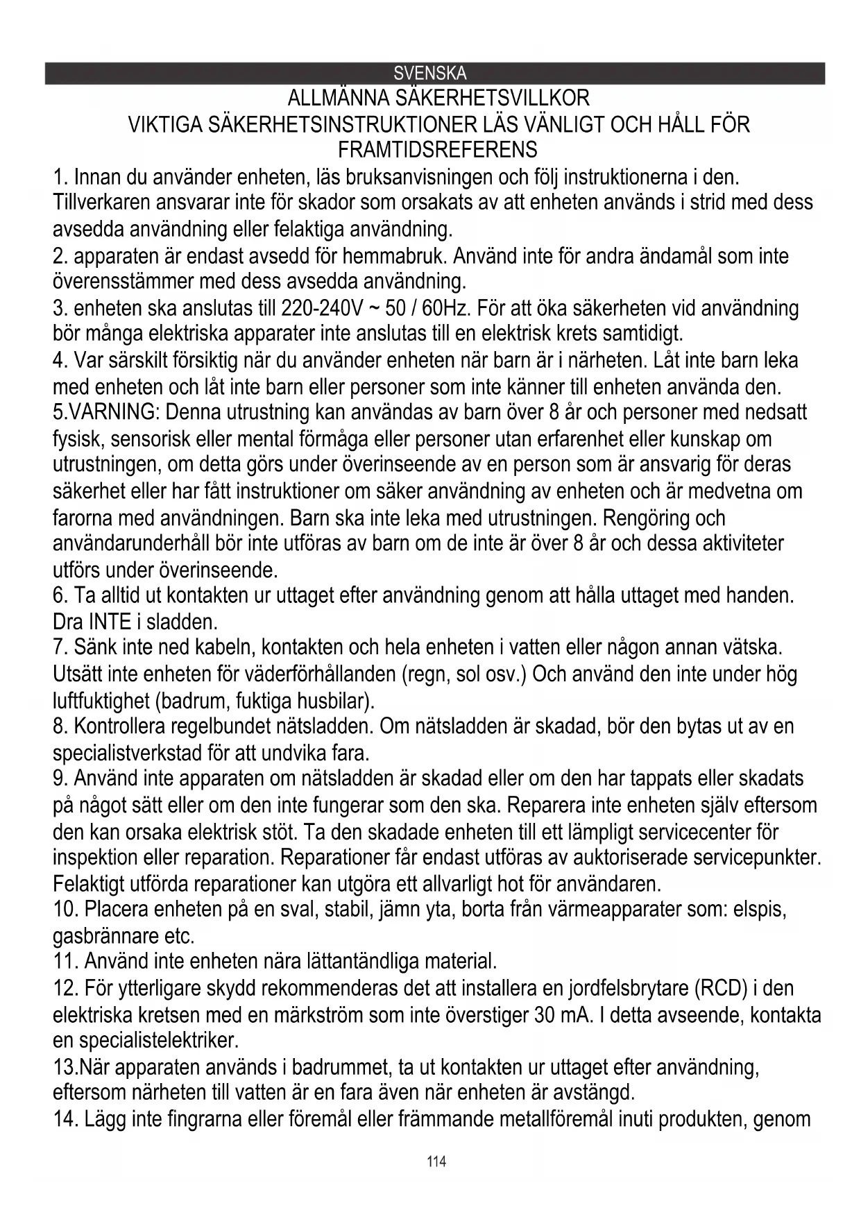 elektriska kretsen med en märkström som inte överstiger 30 mA. I detta avseende, kontakta en specialistelektriker. 13.När apparaten används i badrummet, ta ut kontakten ur uttaget efter användning, eftersom närheten till vatten är en fara även när enheten är avstängd.