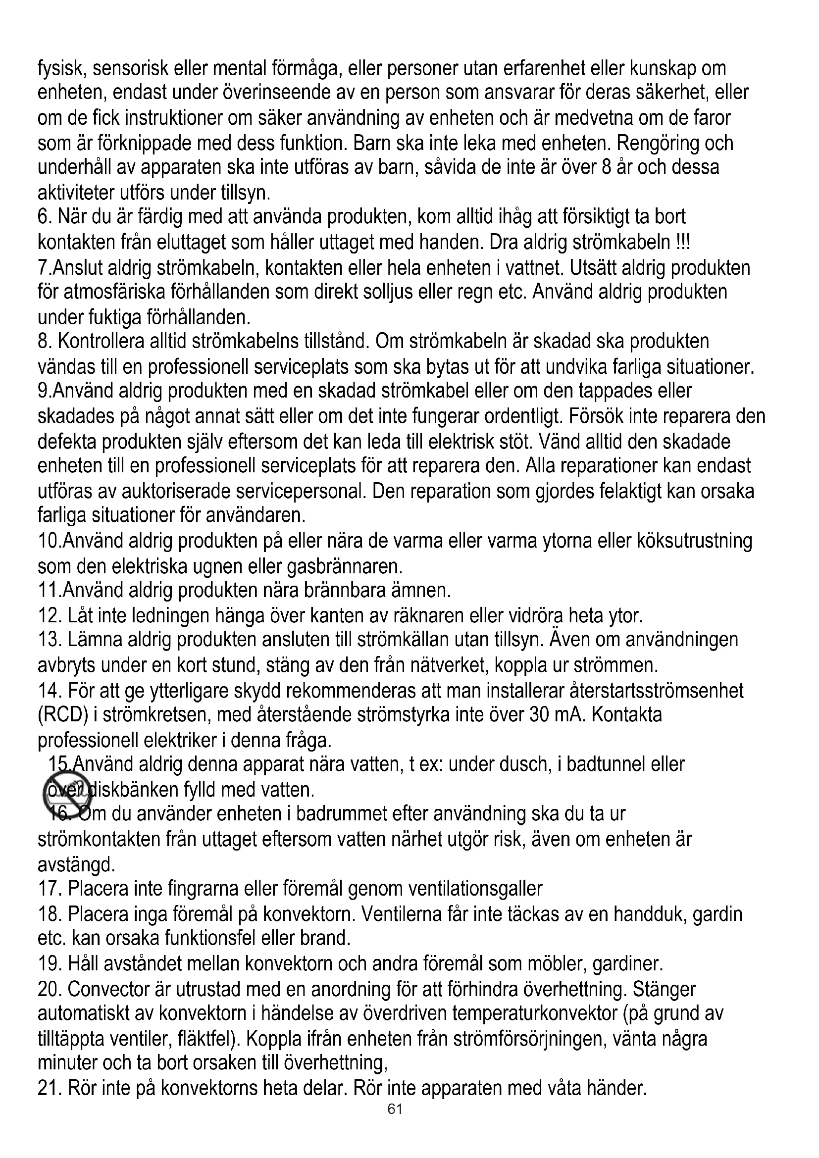 (RCD) i strömkretsen, med återstående strömstyrka inte över 30 mA. Kontakta professionell elektriker i denna fråga. 15.Använd aldrig denna apparat nära vatten, t ex: under dusch, i badtunnel eller över diskbänken fylld med vatten.