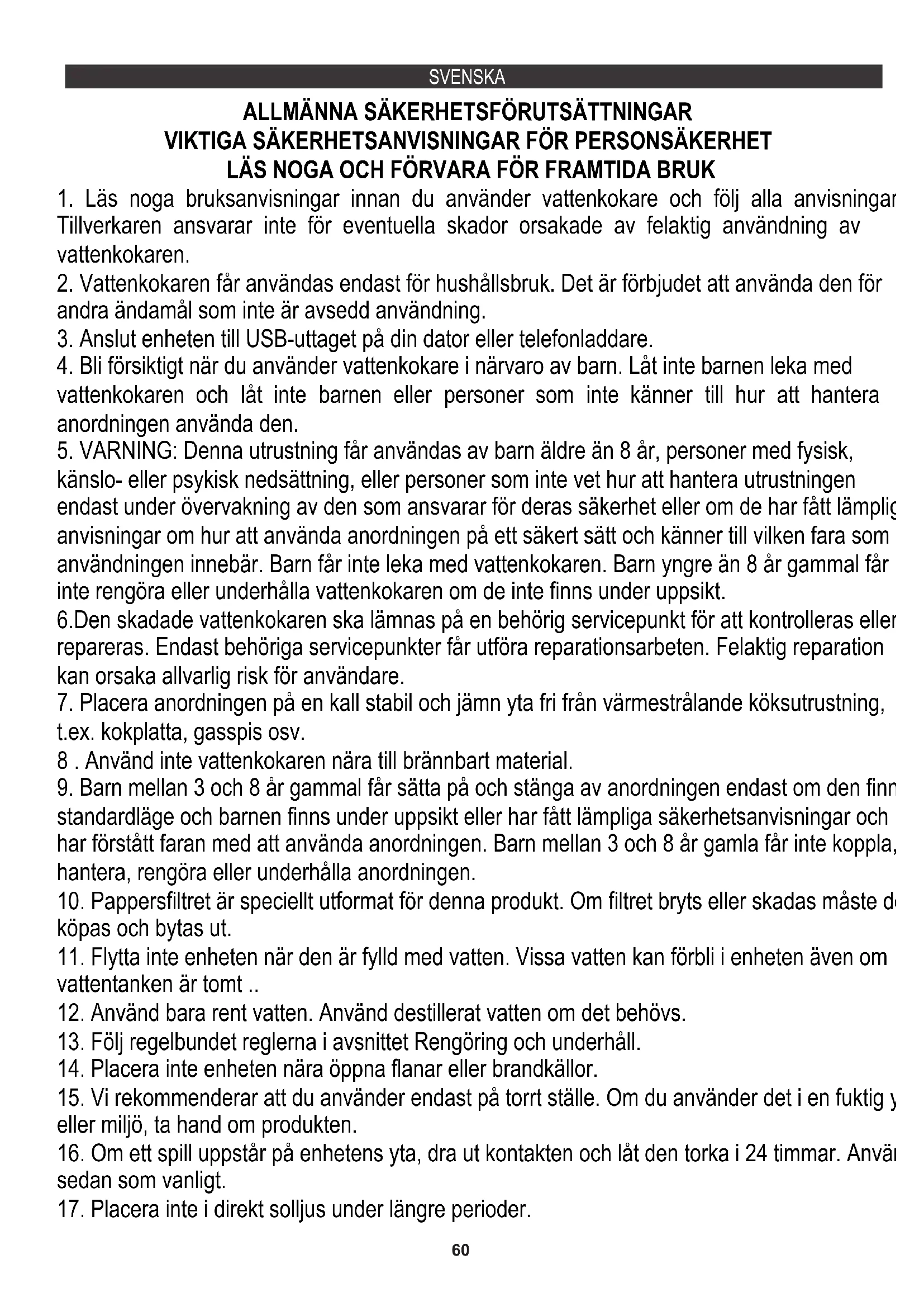 Tillverkaren ansvarar inte för eventuella skador orsakade av felaktig användning av vattenkokaren.
