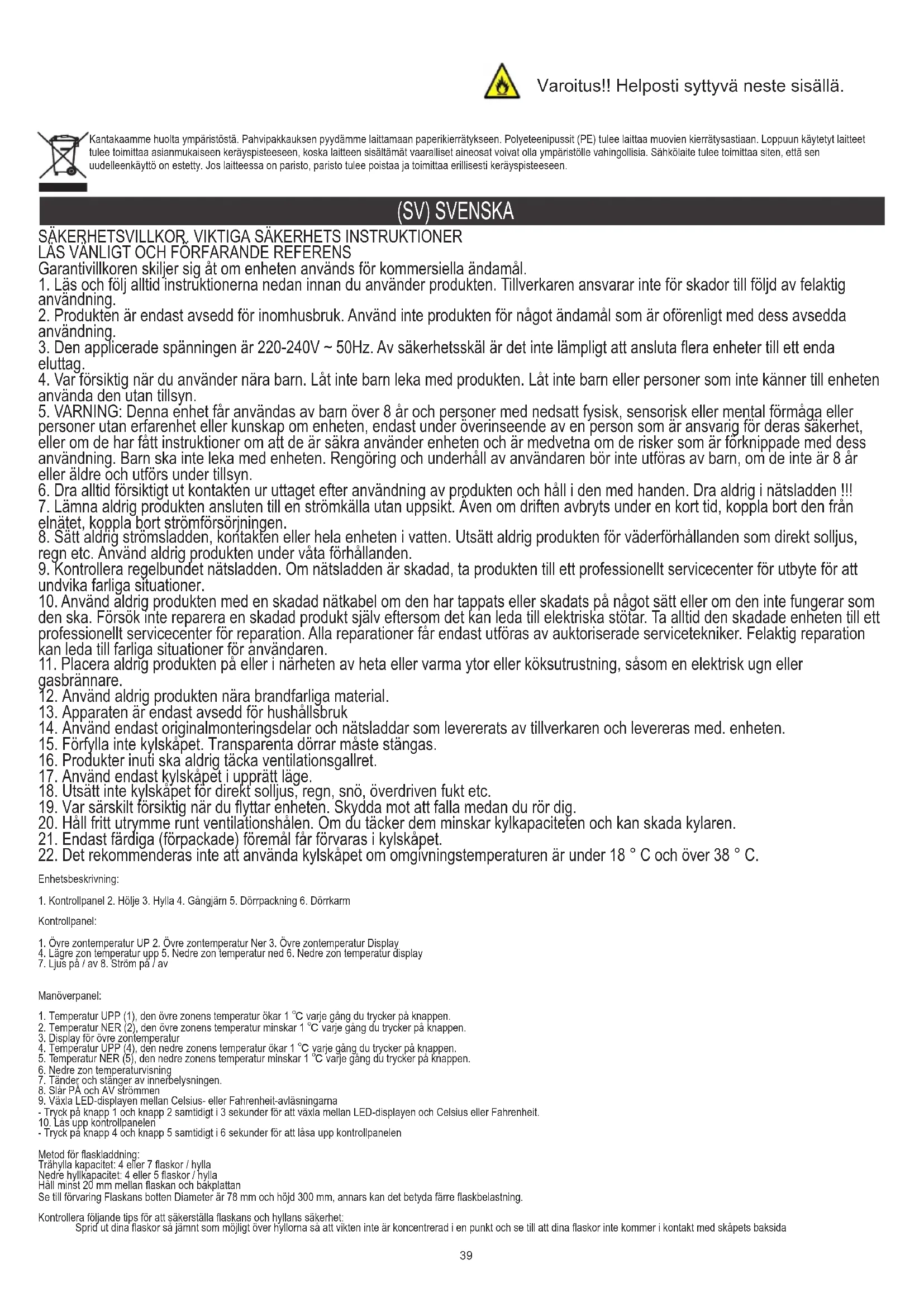 - Tryck på knapp 4 och knapp 5 samtidigt i 6 sekunder för att låsa upp kontrollpanelen Metod för flaskladdning: Trähylla kapacitet: 4 eller 7 flaskor / hylla Nedre hyllkapacitet: 4 eller 5 flaskor / hylla Håll minst 20 mm mellan flaskan och bakplattan Se till förvaring Flaskans botten Diameter är 78 mm och höjd 300 mm, annars kan det betyda färre flaskbelastning. Kontrollera följande tips för att säkerställa flaskans och hyllans säkerhet: Sprid ut dina flaskor så jämnt som möjligt över hyllorna så att vikten inte är koncentrerad i en punkt och se till att dina flaskor inte kommer i kontakt med skåpets baksida Varoitus!! Helposti syttyvä neste sisällä.40 Se till att flaskorna inte är grupperade i toppen eller botten av skåpet Följ lastningsinstruktionerna i avsnittet ovan, beroende på vilken typ av förvaringsutrustning som ditt skåp är utrustat med, och stapla aldrig flaskor på en glidhylla. Luftfuktigheten kommer att variera baserat på rumsfuktighet och temperatur, lägg till en speciell film mellan flaskorna innan förvaring i skåpet, vilket säkerställer att etiketten på flaskan inte skadas.