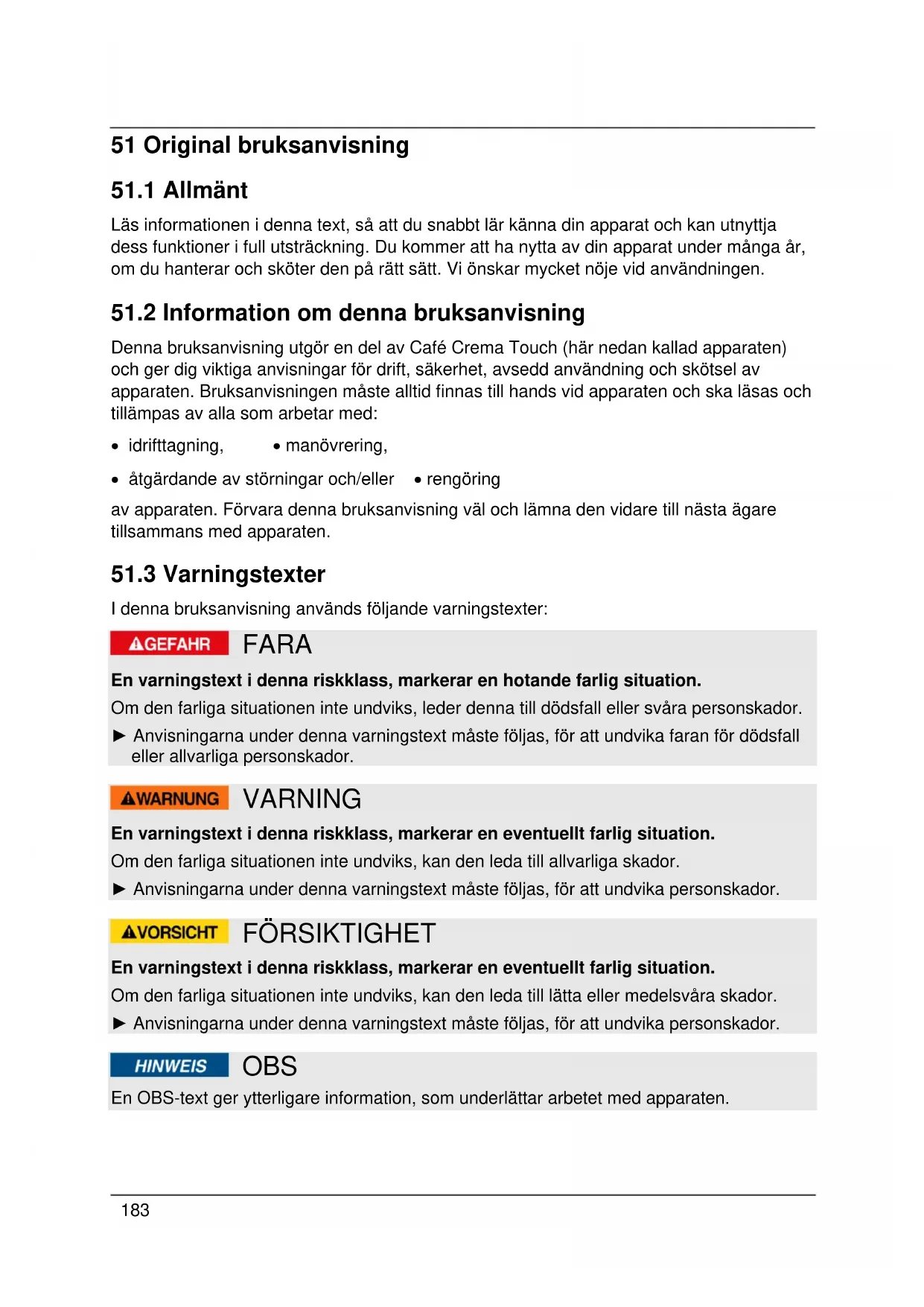 I denna bruksanvisning används följande varningstexter: FARA En varningstext i denna riskklass, markerar en hotande farlig situation. Om den farliga situationen inte undviks, leder denna till dödsfall eller svåra personskador. ► Anvisningarna under denna varningstext måste följas, för att undvika faran för dödsfall eller allvarliga personskador. VARNING En varningstext i denna riskklass, markerar en eventuellt farlig situation. Om den farliga situationen inte undviks, kan den leda till allvarliga skador. ► Anvisningarna under denna varningstext måste följas, för att undvika personskador. FÖRSIKTIGHET En varningstext i denna riskklass, markerar en eventuellt farlig situation. Om den farliga situationen inte undviks, kan den leda till lätta eller medelsvåra skador. ► Anvisningarna under denna varningstext måste följas, för att undvika personskador. OBS En OBS-text ger ytterligare information, som underlättar arbetet med apparaten.184