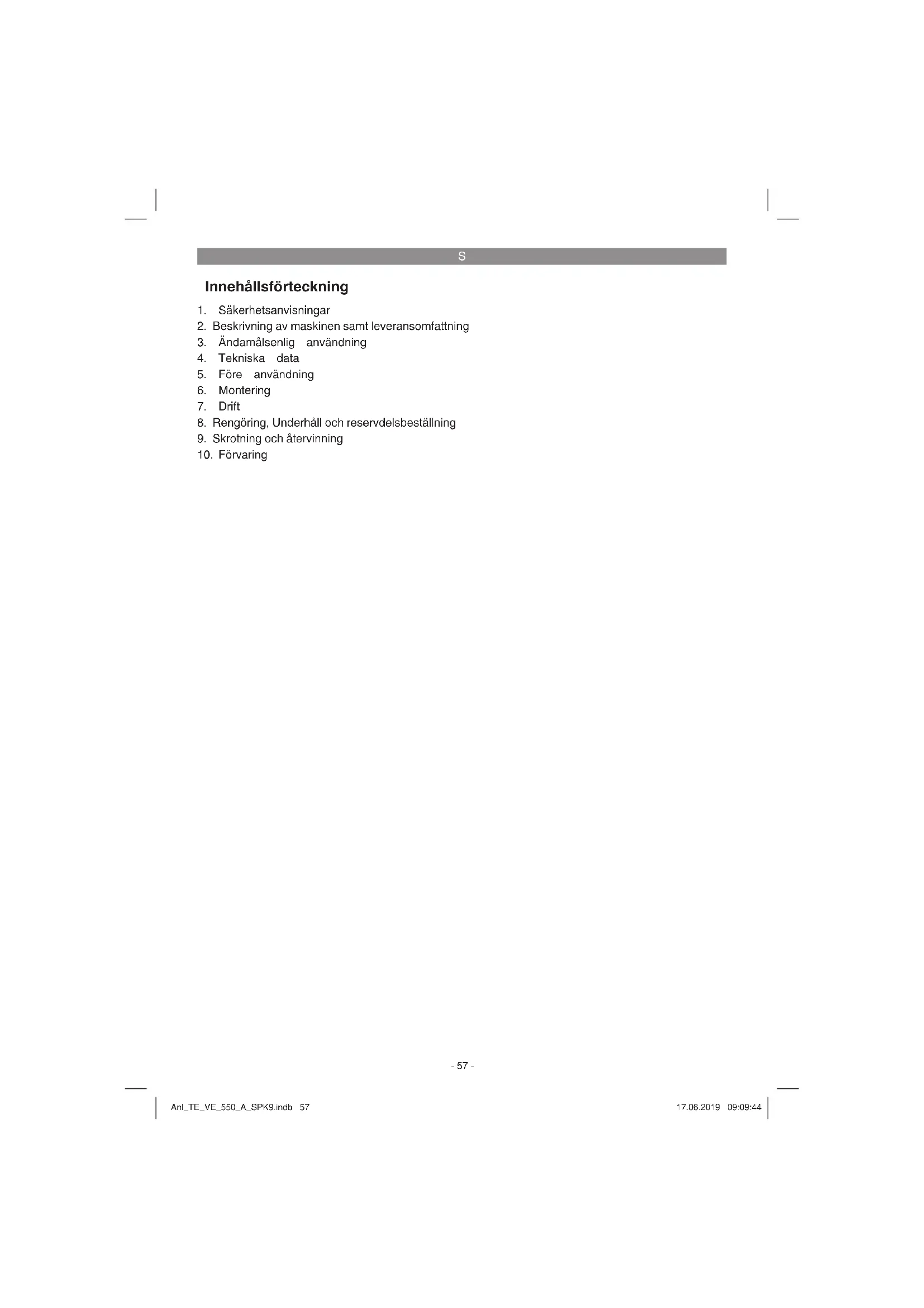Endast för EU-länder Kasta inte elverktyg i hushållssoporna. Enligt det europeiska direktivet 2012/19/EG om avfall som utgörs av eller innehåller elektriska eller elektroniska produkter och dess tillämpning i den nationella lagstiftningen, måste förbrukade elverktyg källsorteras och lämnas in för miljövänlig återvinning. Återvinnings-alternativ till begäran om återsändning: Som ett alternativ till returnering är ägaren av elutrustningen skyldig att bidraga till ändamålsenlig av- fallshantering för det fall att utrustningen ska skrotas. Efter att den förbrukade utrustningen har lämnats in till en avfallsstation kan den omhändertas i enlighet med gällande nationella lagstiftning om återvin- ning och avfallshantering. Detta gäller inte för tillbehörsdelar och hjälpmedel utan elektriska komponen- ter vars syfte har varit att komplettera den förbrukade utrustningen. Eftertryck eller annan duplicering av dokumentation och medföljande underlag för produkterna, även utdrag, är endast tillåtet med uttryckligt tillstånd från iSC GmbH. Med förbehåll för tekniska ändringar. Anl_TE_VE_550_A_SPK9.indb 64Anl_TE_VE_550_A_SPK9.indb 64 17.06.2019 09:09:4517.06.2019 09:09:45S