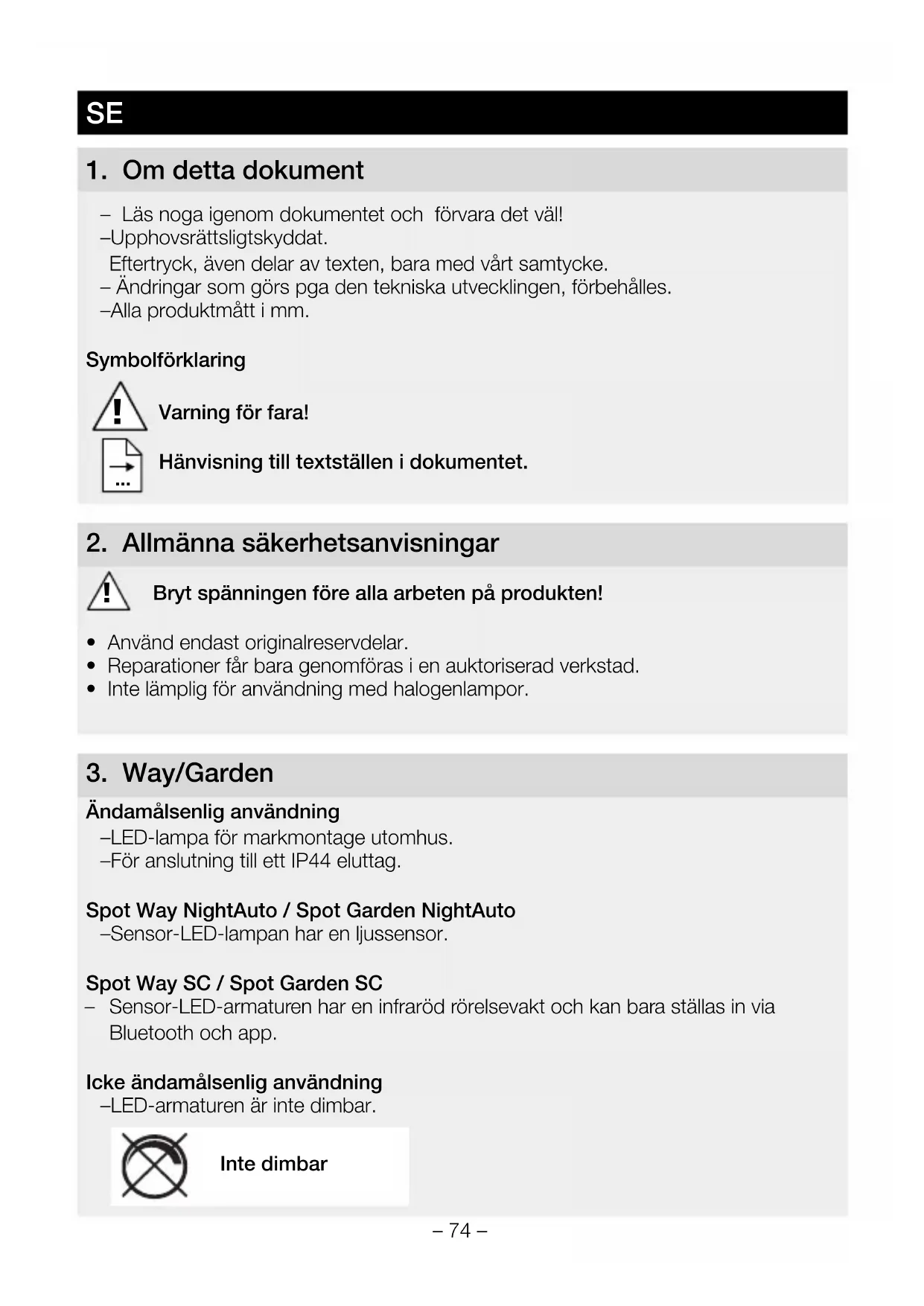 Ändamålsenlig användning – LED-lampa för markmontage utomhus. – För anslutning till ett IP44 eluttag. Spot Way NightAuto / Spot Garden NightAuto – Sensor-LED-lampan har en ljussensor. Spot Way SC / Spot Garden SC – Sensor-LED-armaturen har en infraröd rörelsevakt och kan bara ställas in via Bluetooth och app. Icke ändamålsenlig användning – LED-armaturen är inte dimbar. Inte dimbar– 75 – Innehåll Spot Way (bild 3.1) – Lampa inkl. stativ, bottenplatta och anslutningskabel med nätkontakt – Tre skruvar – Tre pluggar Innehåll Spot Garden (bild 3.2) – Lampa inkl. anslutningskabel med nätkontakt – Jordspett – Två skruvar Produktmått Spot Way (bild 3.3) Produktmått Spot Garden (bild 3.4) Produktöversikt (bild 3.5 – 3.10) A Lampkupa B Rörelsevakt (endast Spot Way / Spot Garden SC) C Ljussensor (endast Spot Way / Garden NightAuto) D Skymningsinställning (endast Spot Way / Garden NightAuto) E Stativ med bottenplatta (endast Spot Way) F Jordspett (endast Spot Garden) G Nätkabel med kontakt Bevakningsområde Spot Way / Spot Garden SC (bild 3.11 – 3.16) Ljusintensitetsfördelning (bild 3.17)